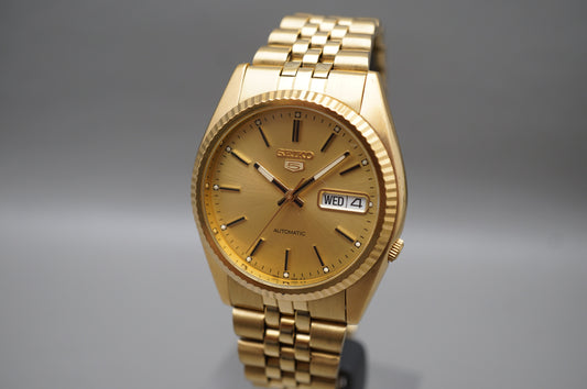Seiko 5 Sports SNXJ94 7S26 Gold Tone Fluted Bezel Day Date Automatic Watch