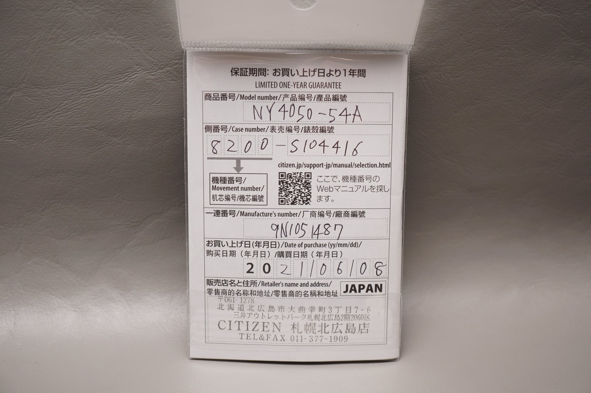 Warranty card: Stamped 2021/06/08