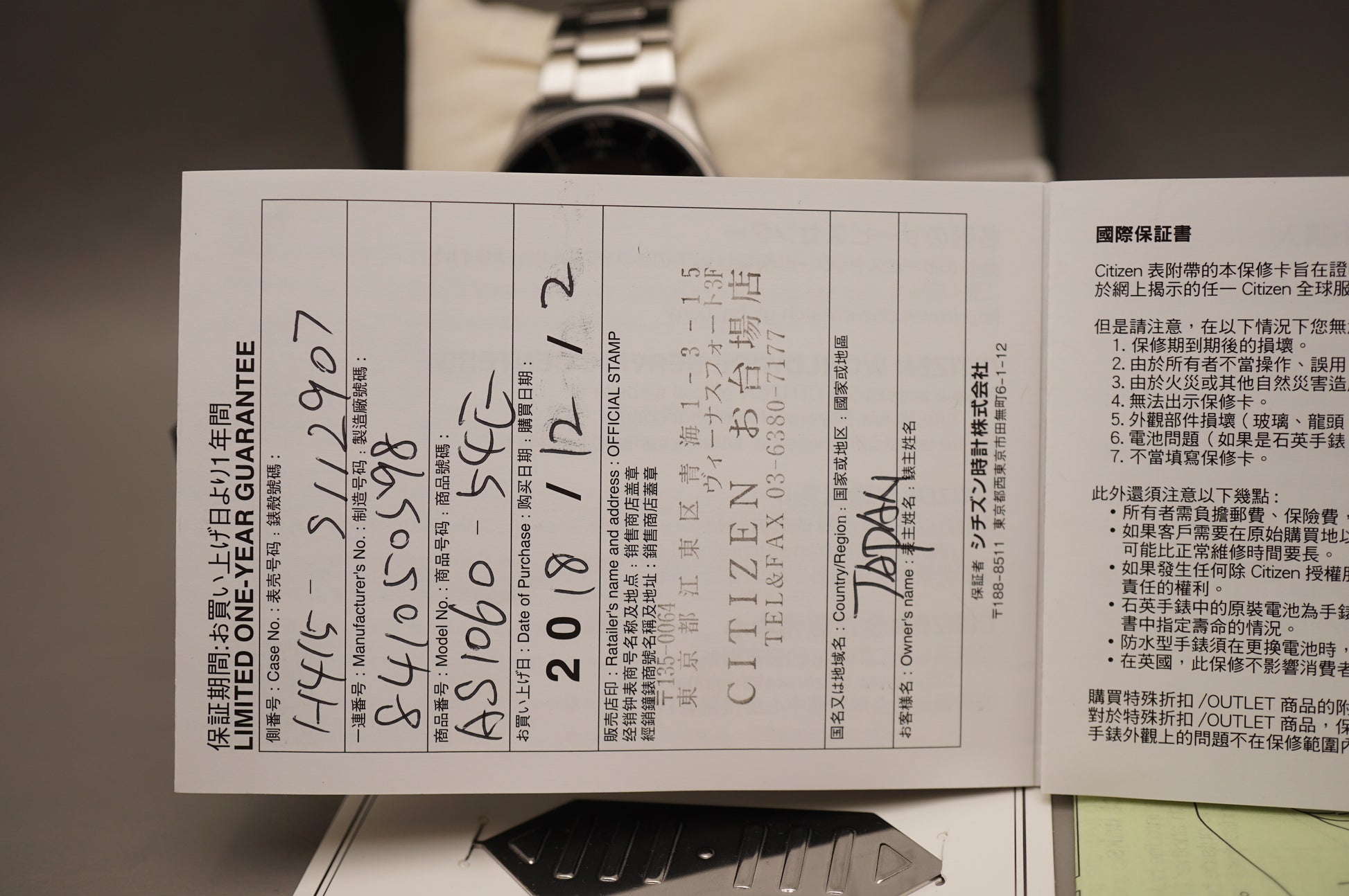Warranty card: Stamped 2018/12/2