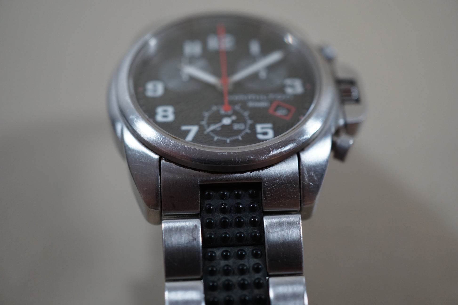 This watch is in used condition and requires repair: quickset date does not work. Comes as pictured on the original bracelet. This piece comes watch only, no accessories included. The bracelet is sized to about 17cm, no extra links are included. Chronograph functions correctly.