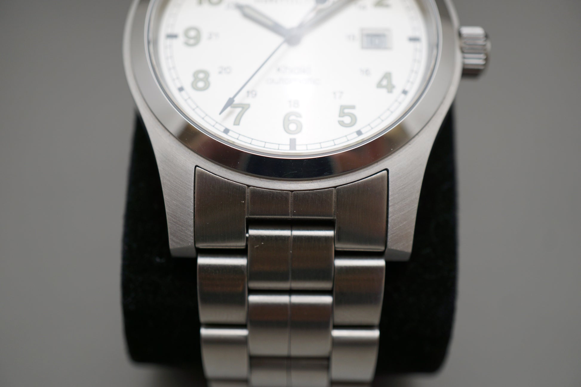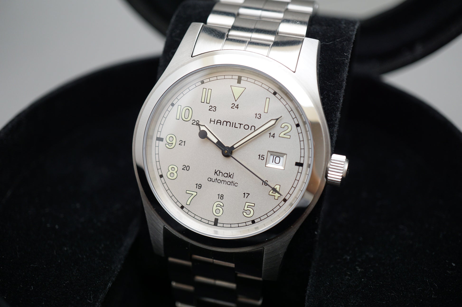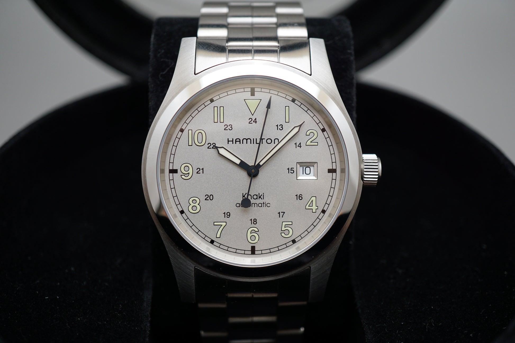 For sale is a Hamilton Khaki Field 041330 Silver Dial 42mm Automatic Watch