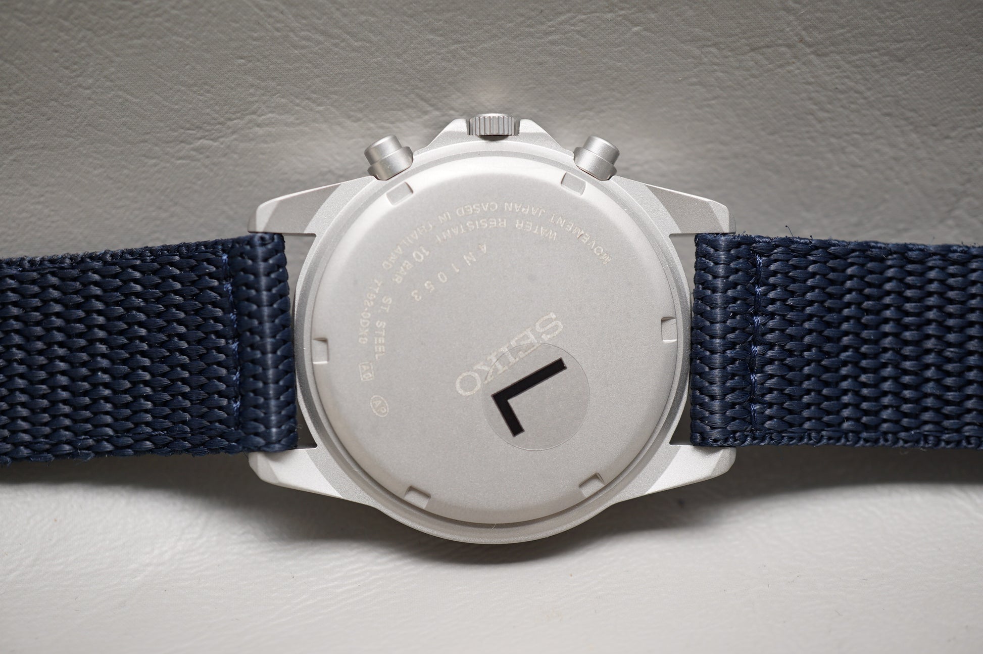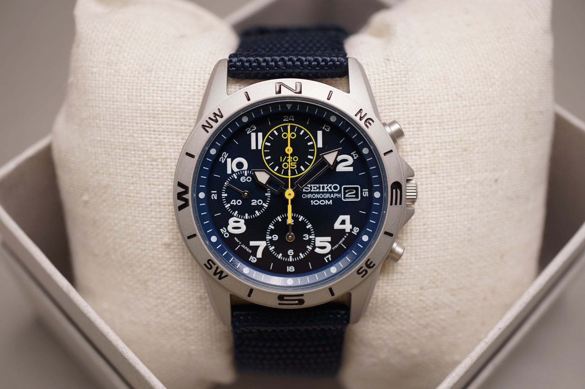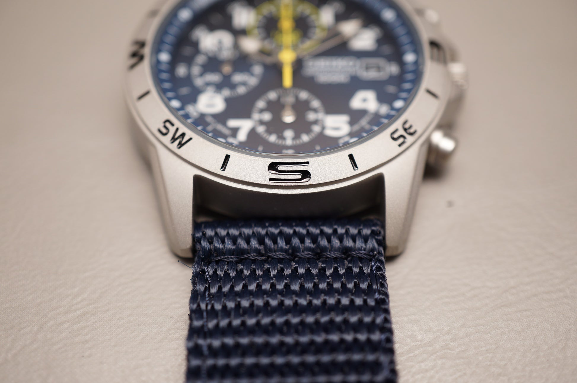 For sale is a Seiko SND379R Nylon Strap Blue Dial Field Style Chronograph Quartz Watch