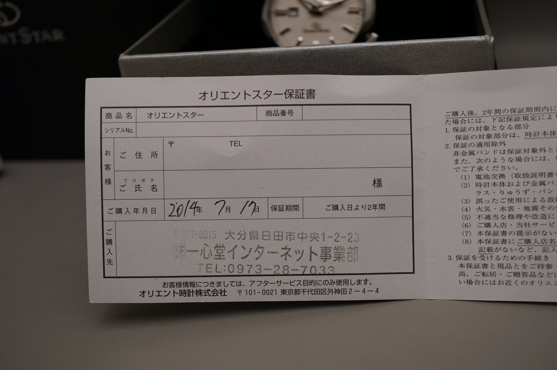 Warranty card: Stamped 2014-7-17