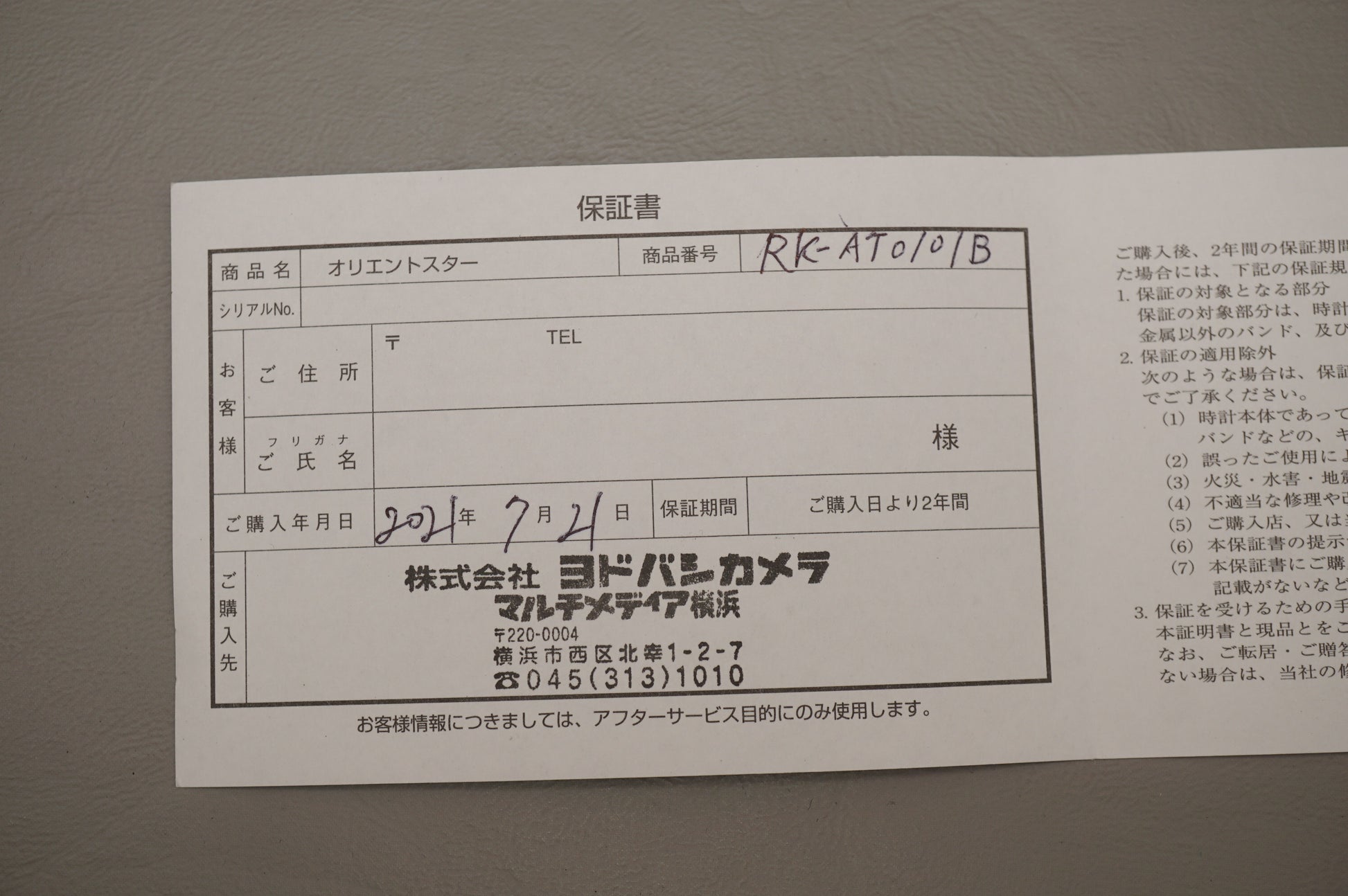 Warranty card: Stamped 2021-7-21