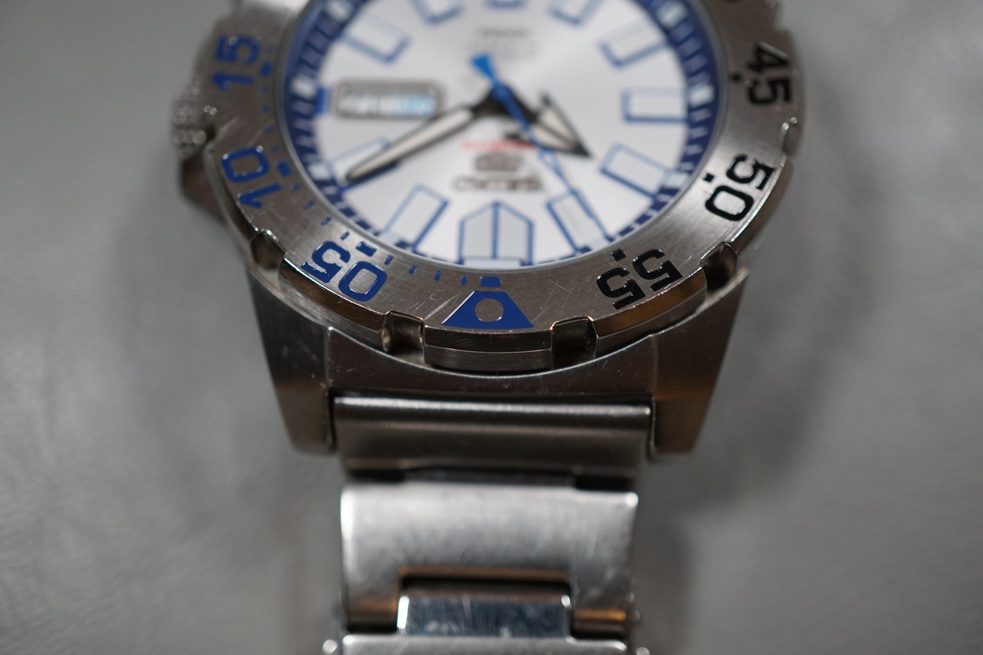For sale is a Seiko 5 Sports SRP481 White Blue "Baby Ice Monster" Automatic Watch