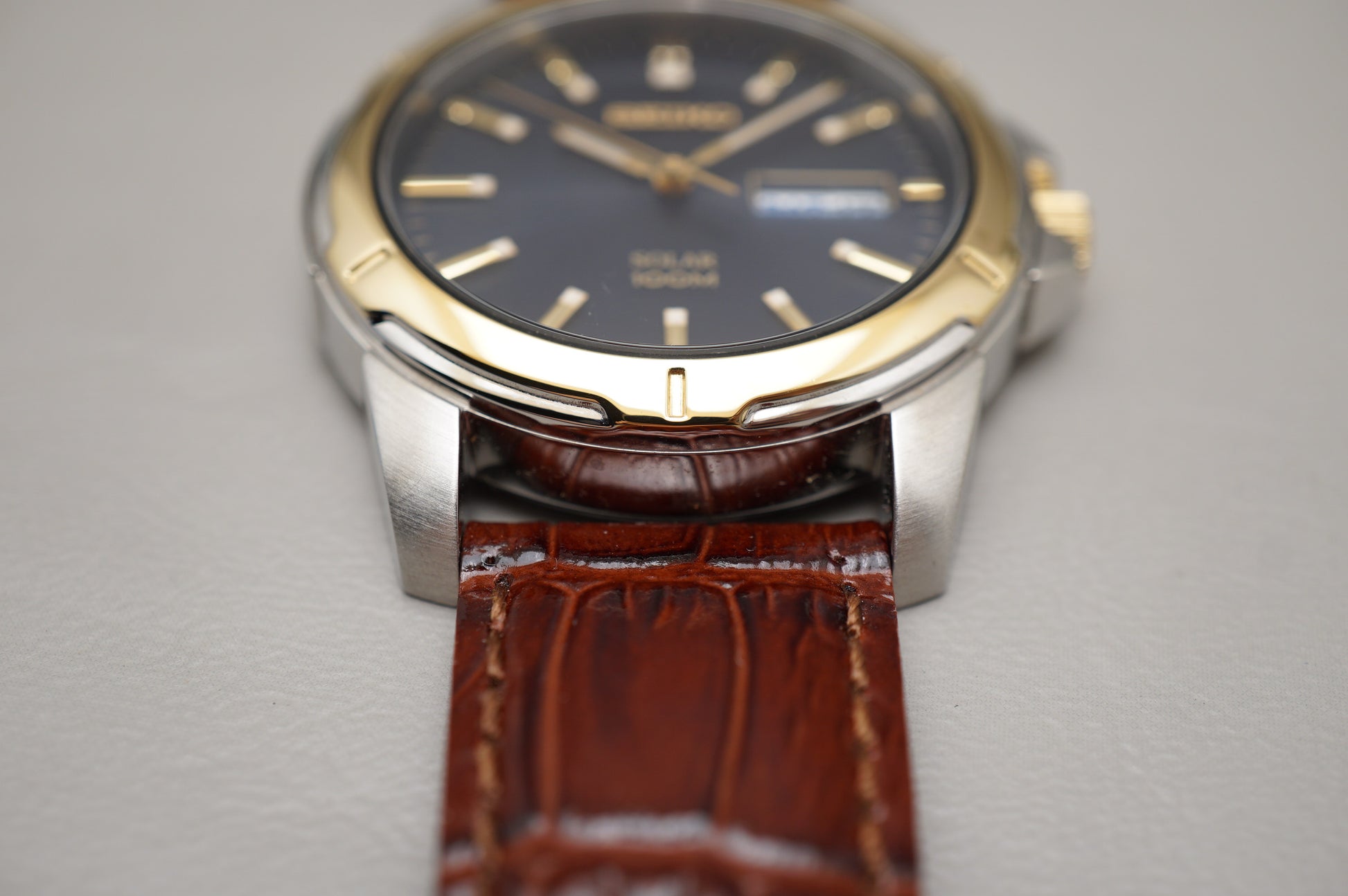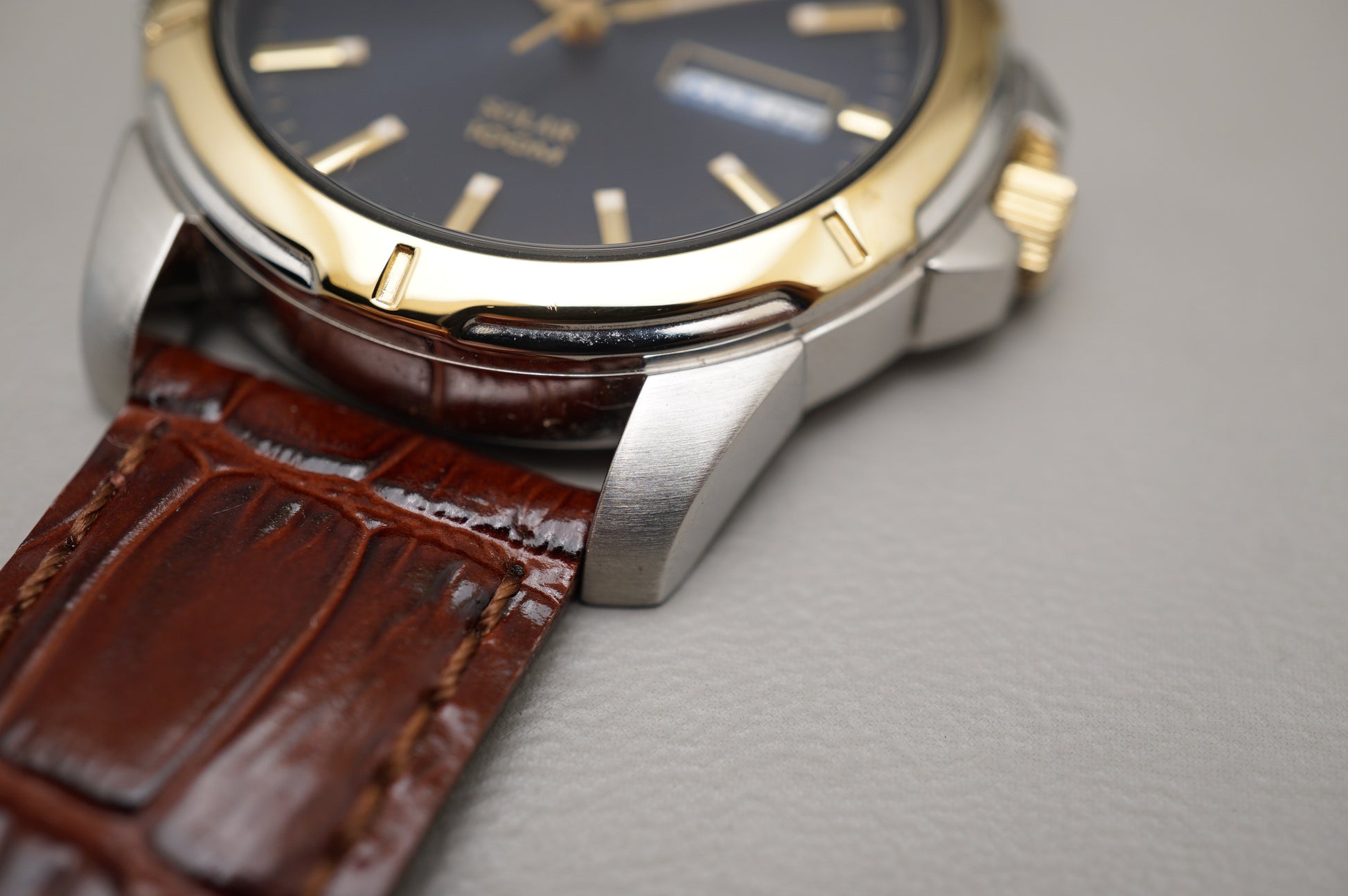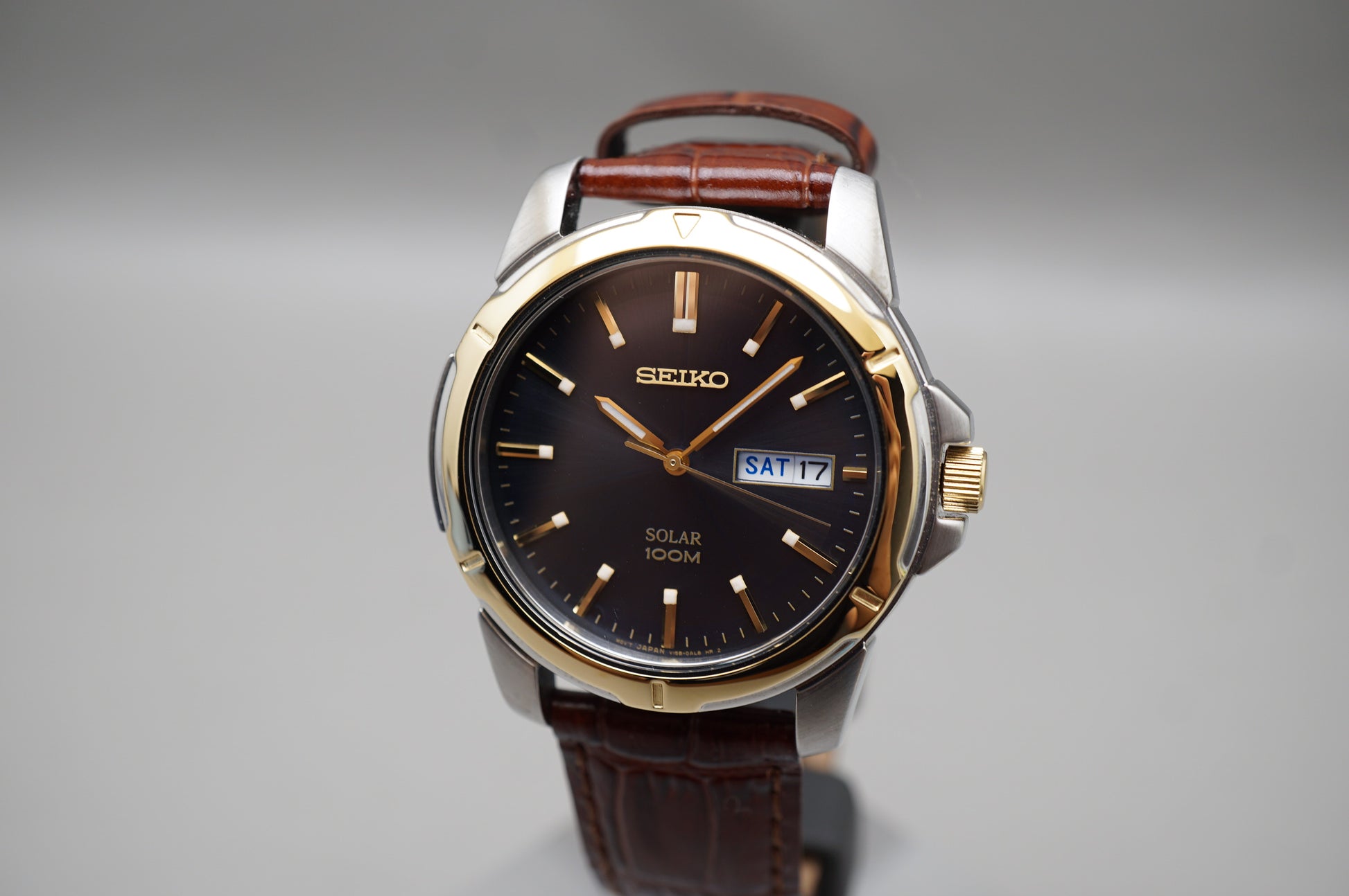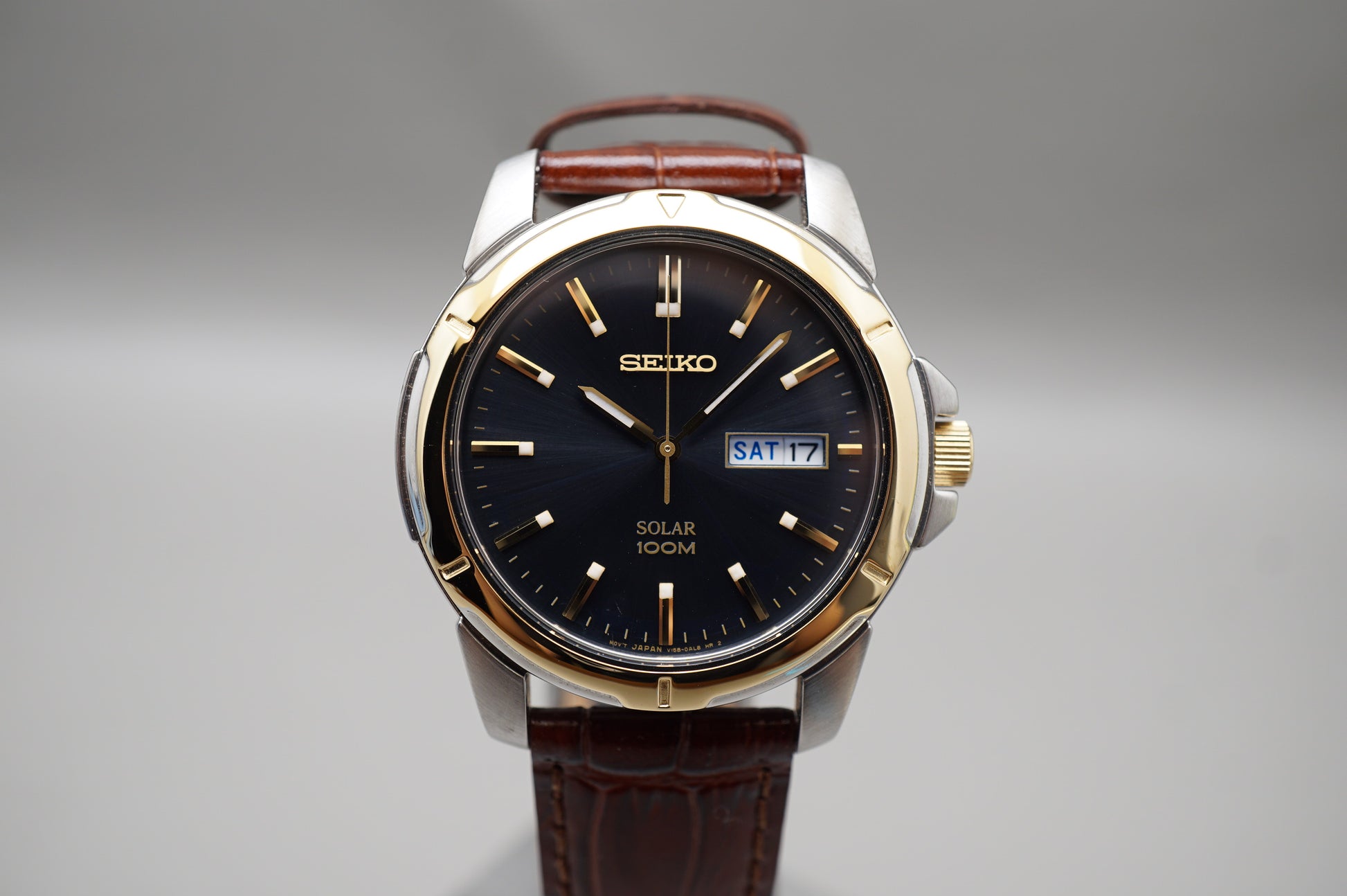 For sale is a Seiko Essentials SNE102 Two Tone Blue Dial Solar 100M Quartz Watch