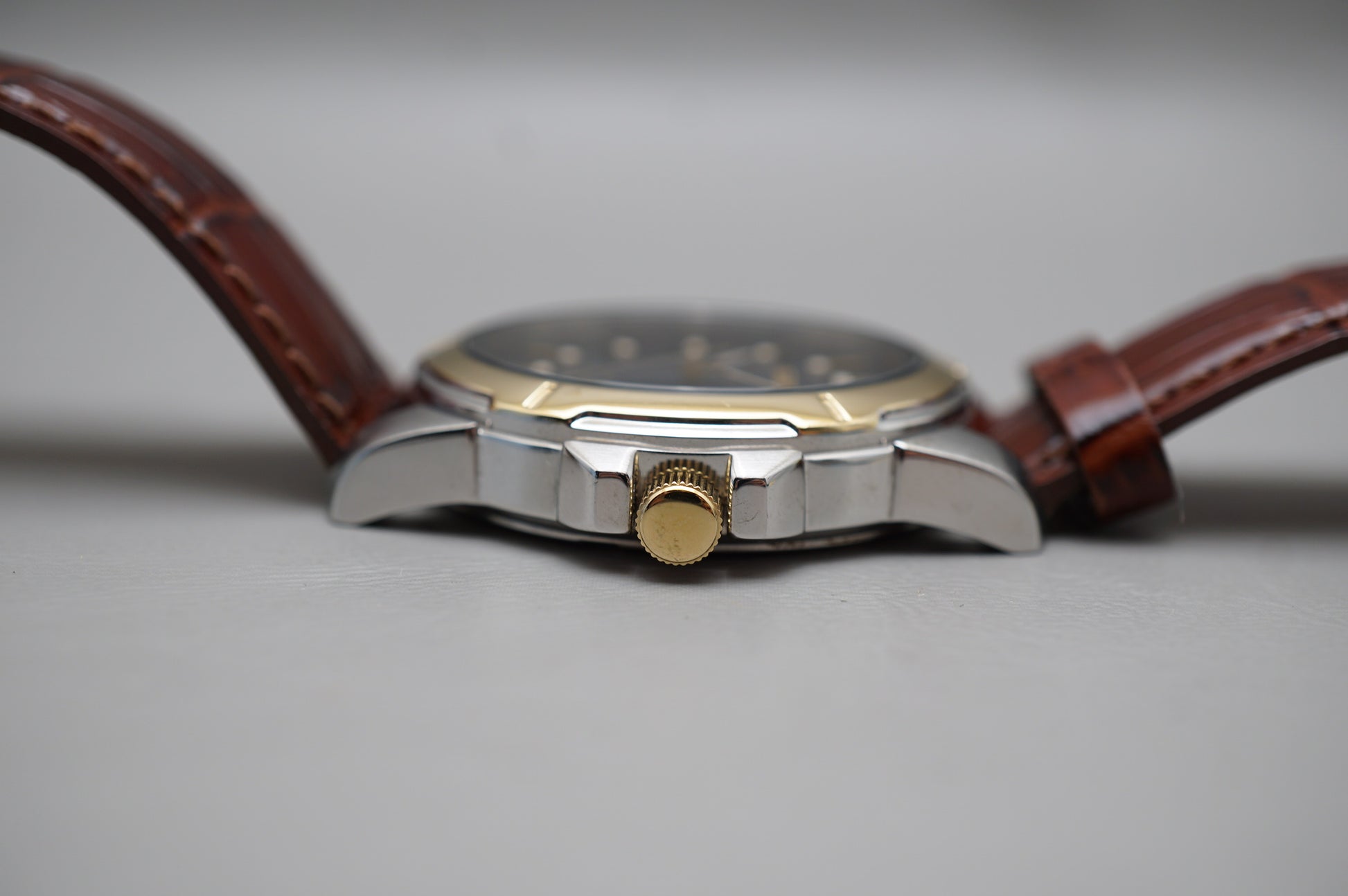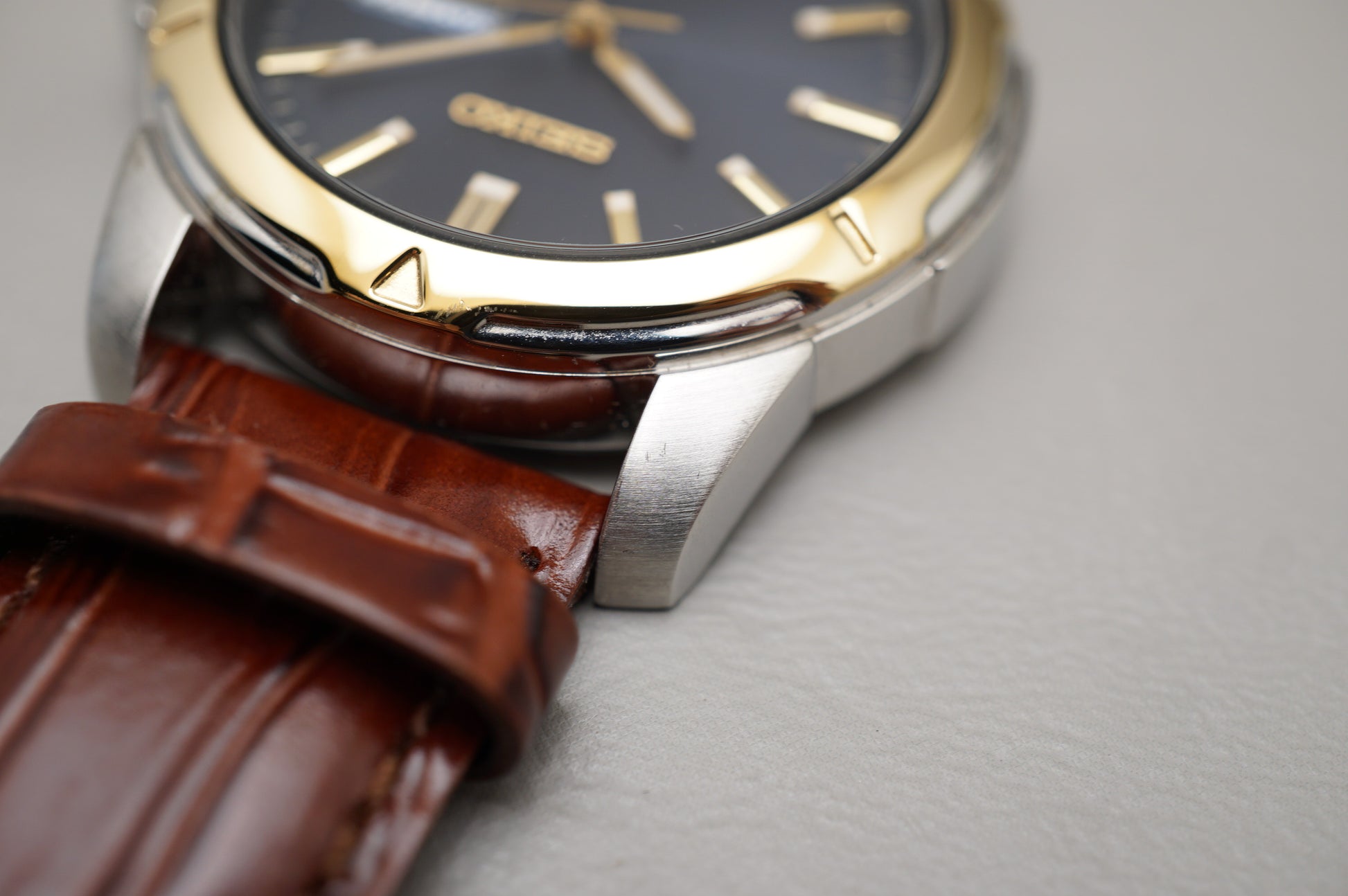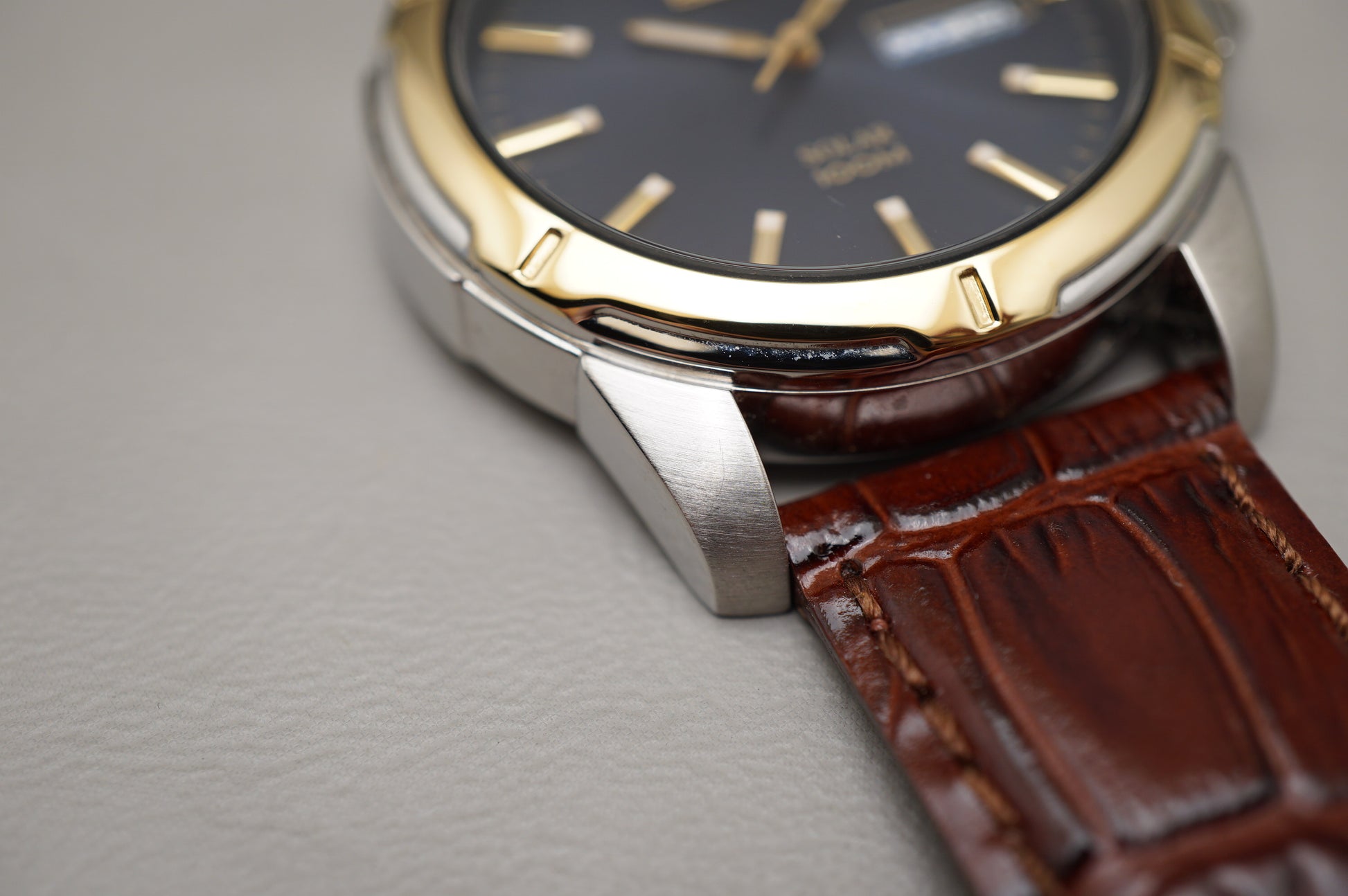 For sale is a Seiko Essentials SNE102 Two Tone Blue Dial Solar 100M Quartz Watch