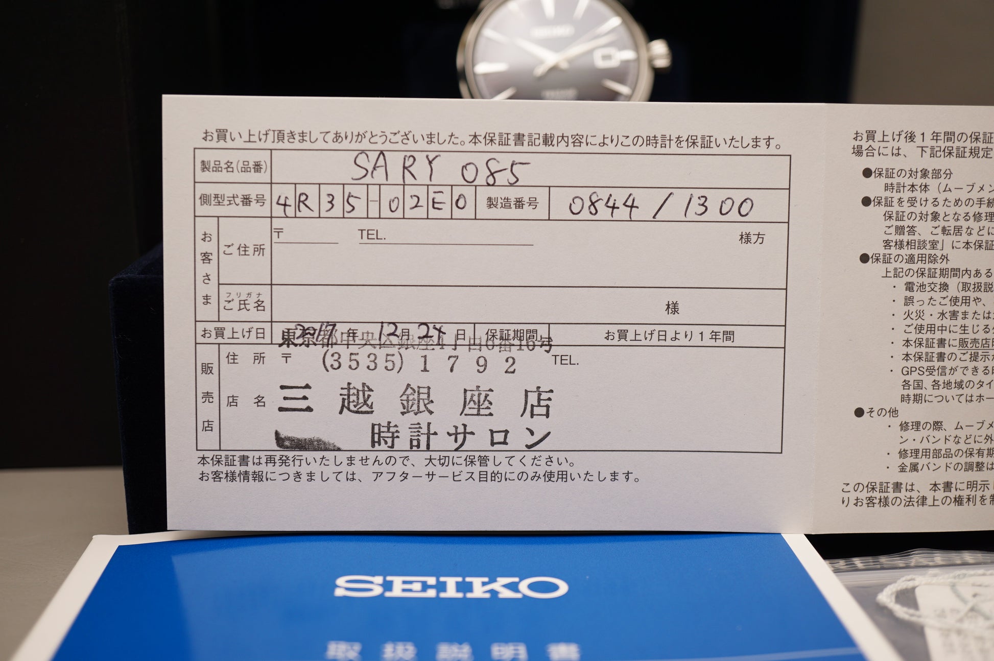 Warranty card: Stamped 2017-12-24