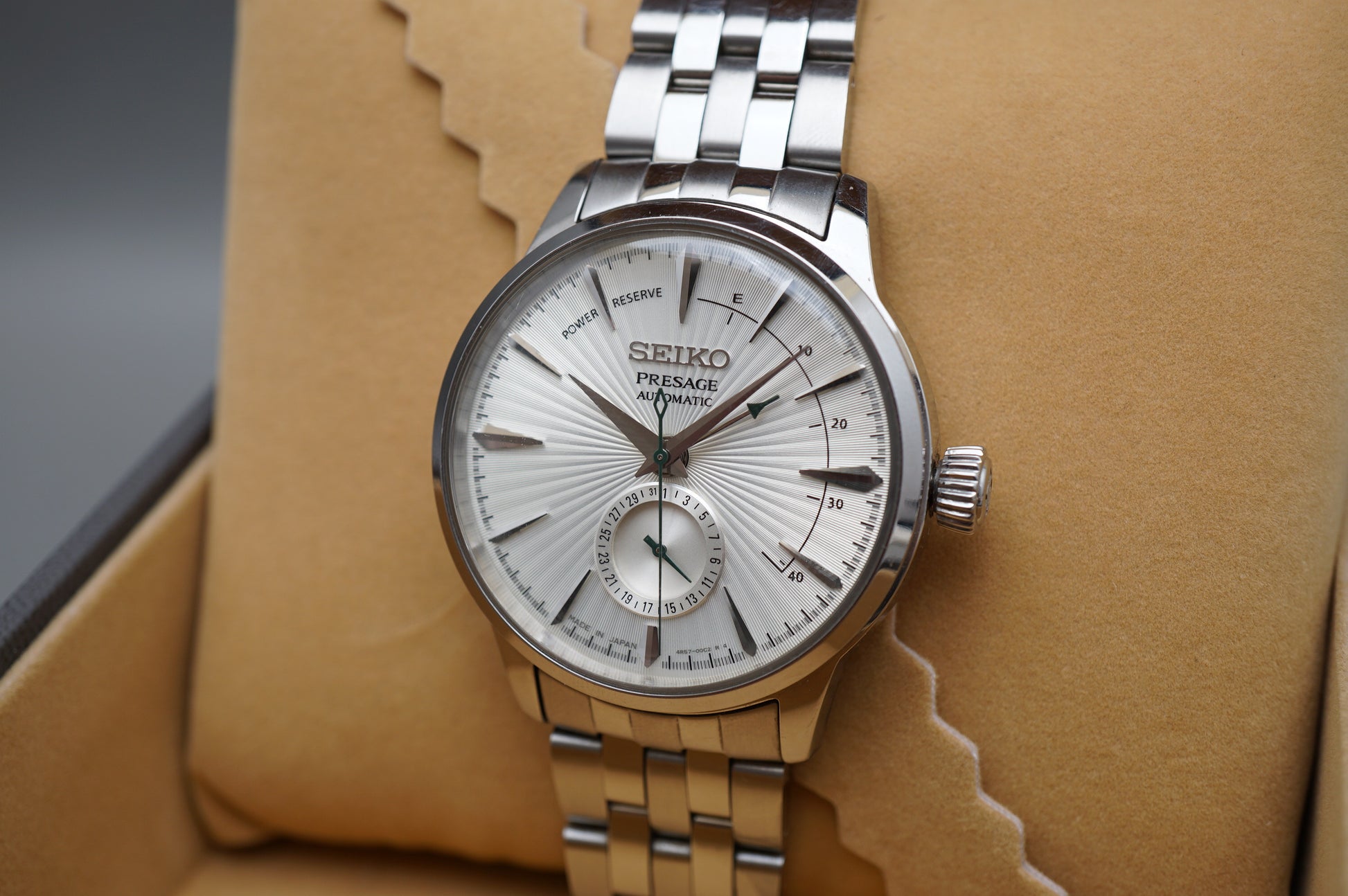 For sale is a Seiko Presage SARY129 Cocktail Time Sunburst Silver Dial Power Reserve Automatic Watch