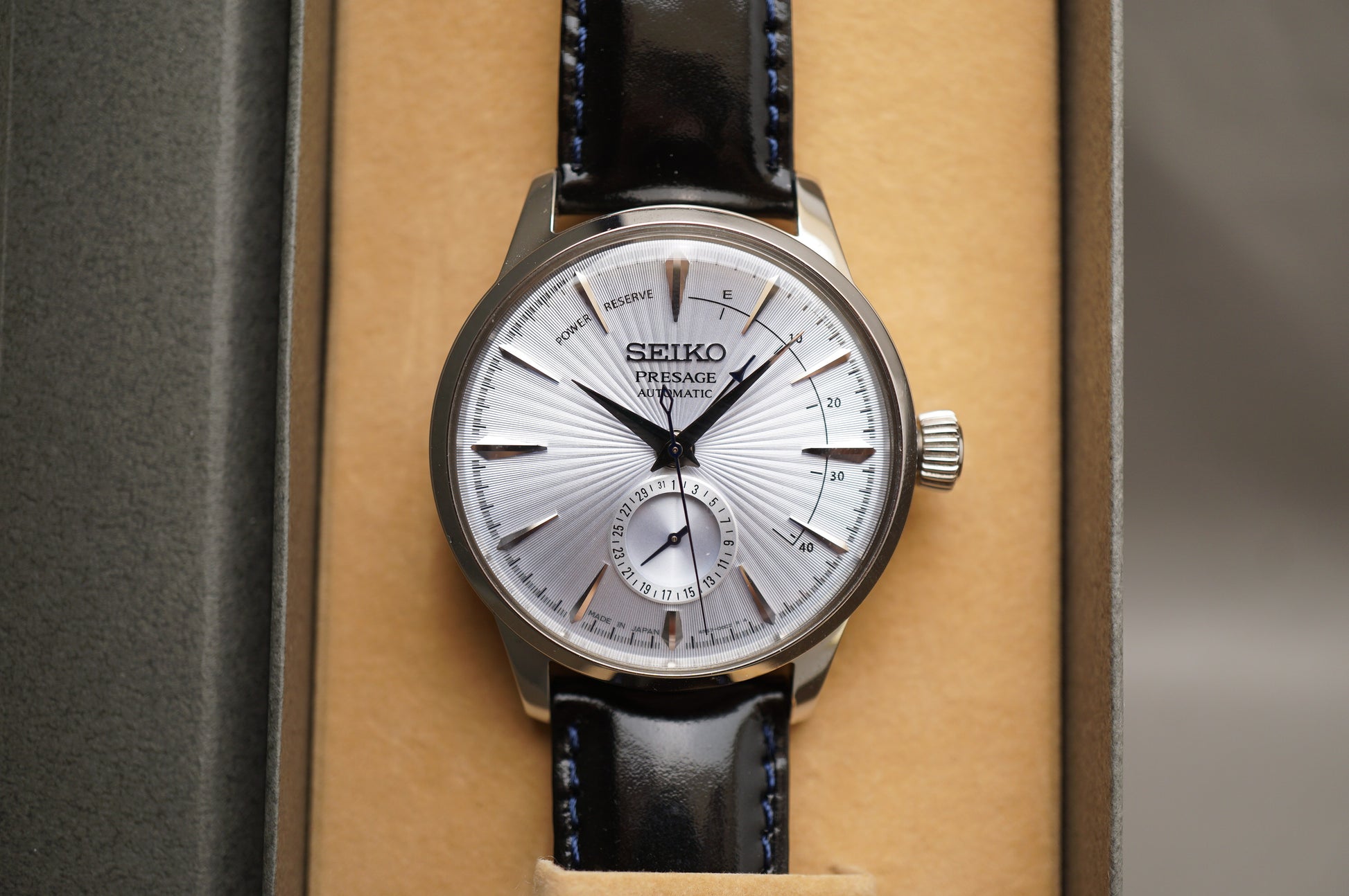 For sale is a Seiko Presage SARY131 Cocktail Time Sunburst Blue Dial Power Reserve Automatic Watch