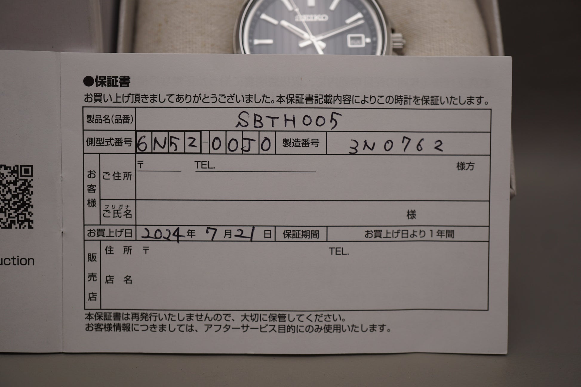 Warranty card: Dated 2024-7-21 but not stamped