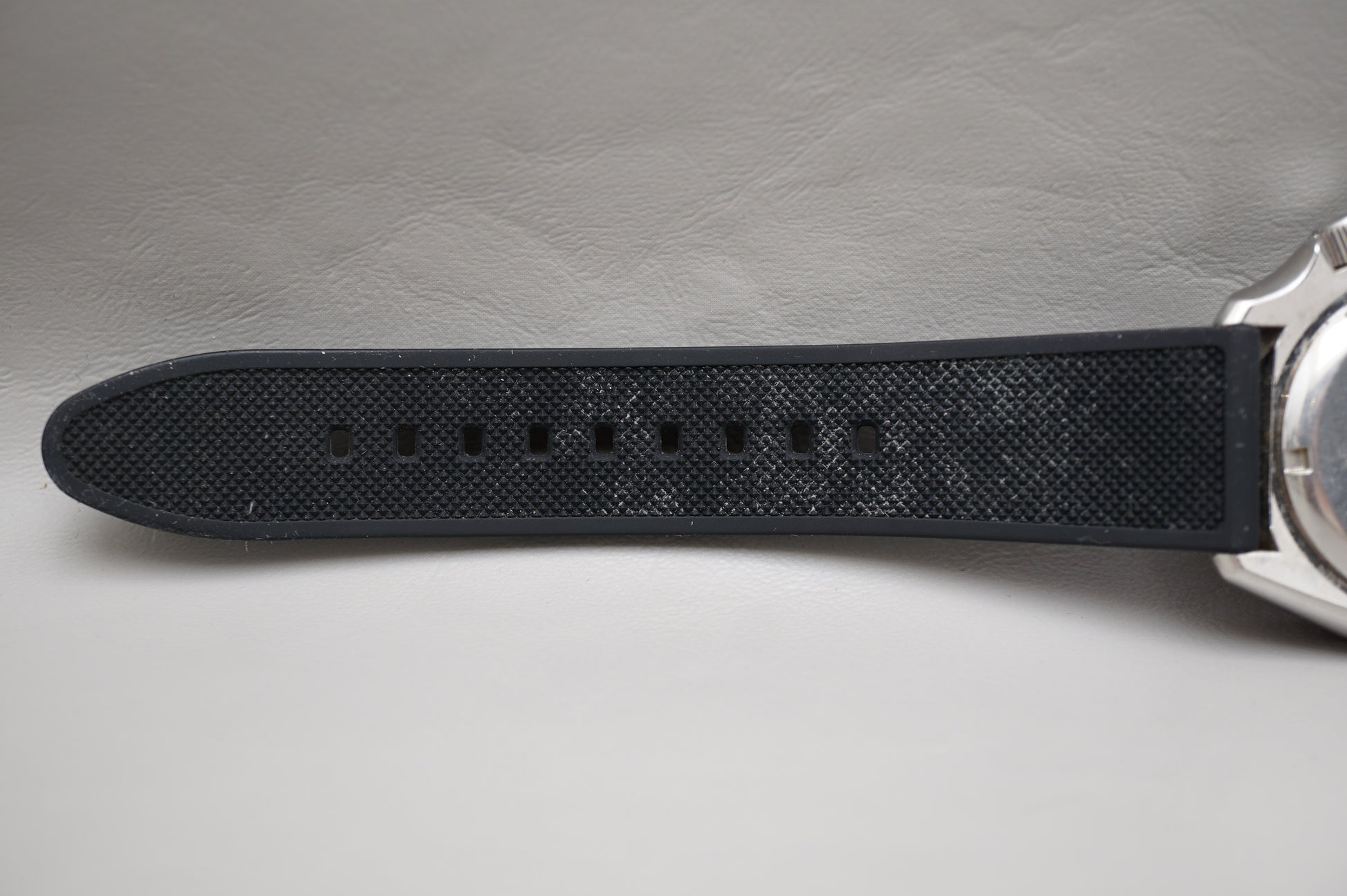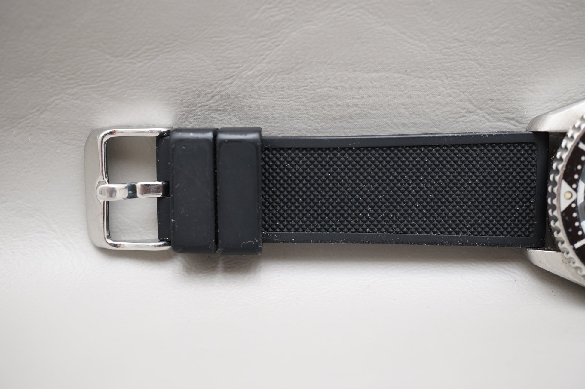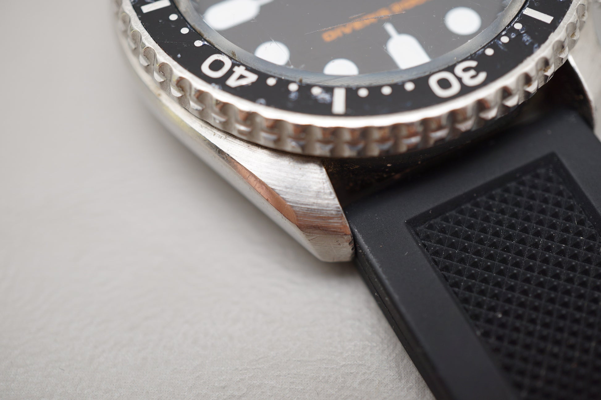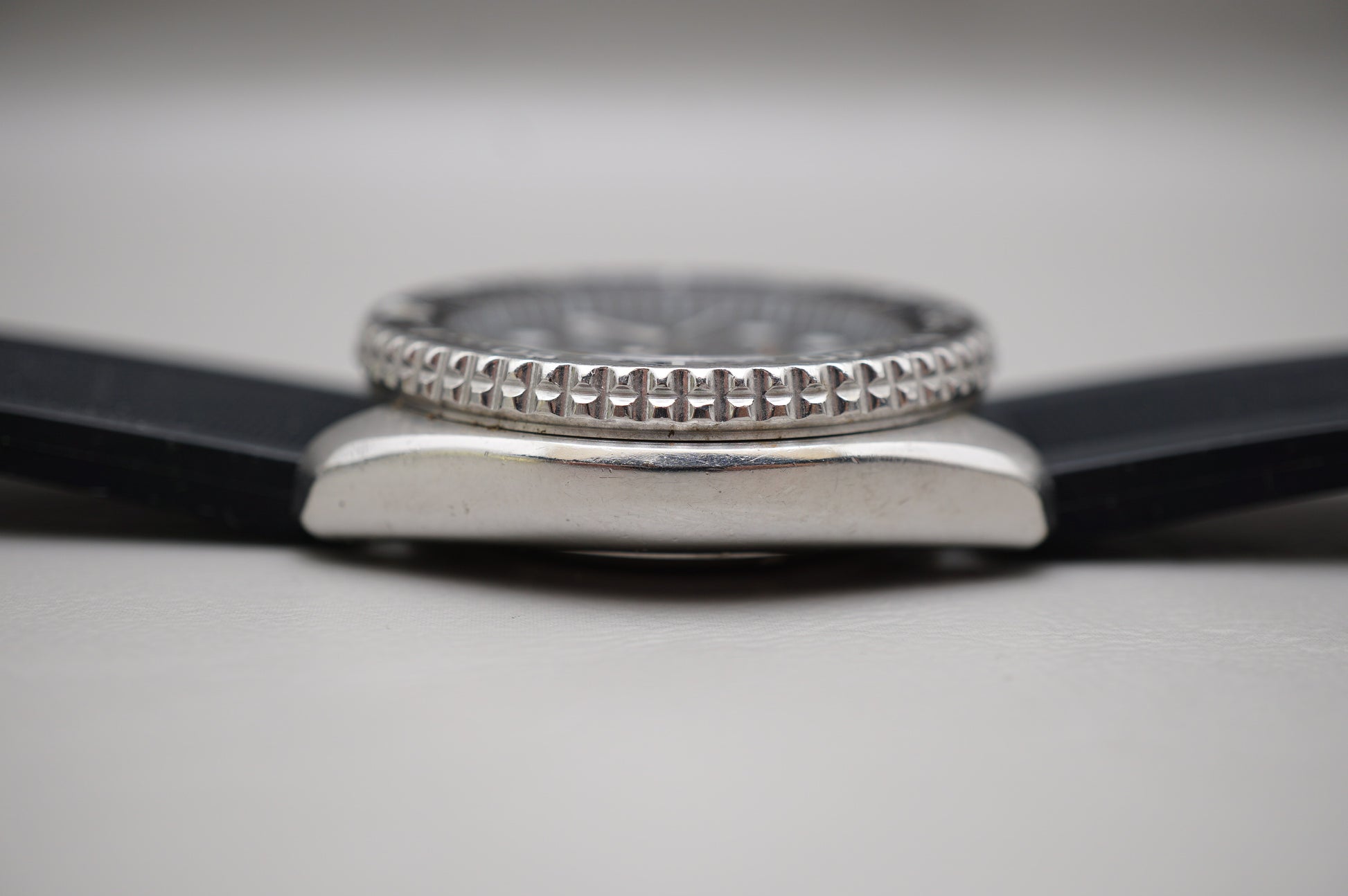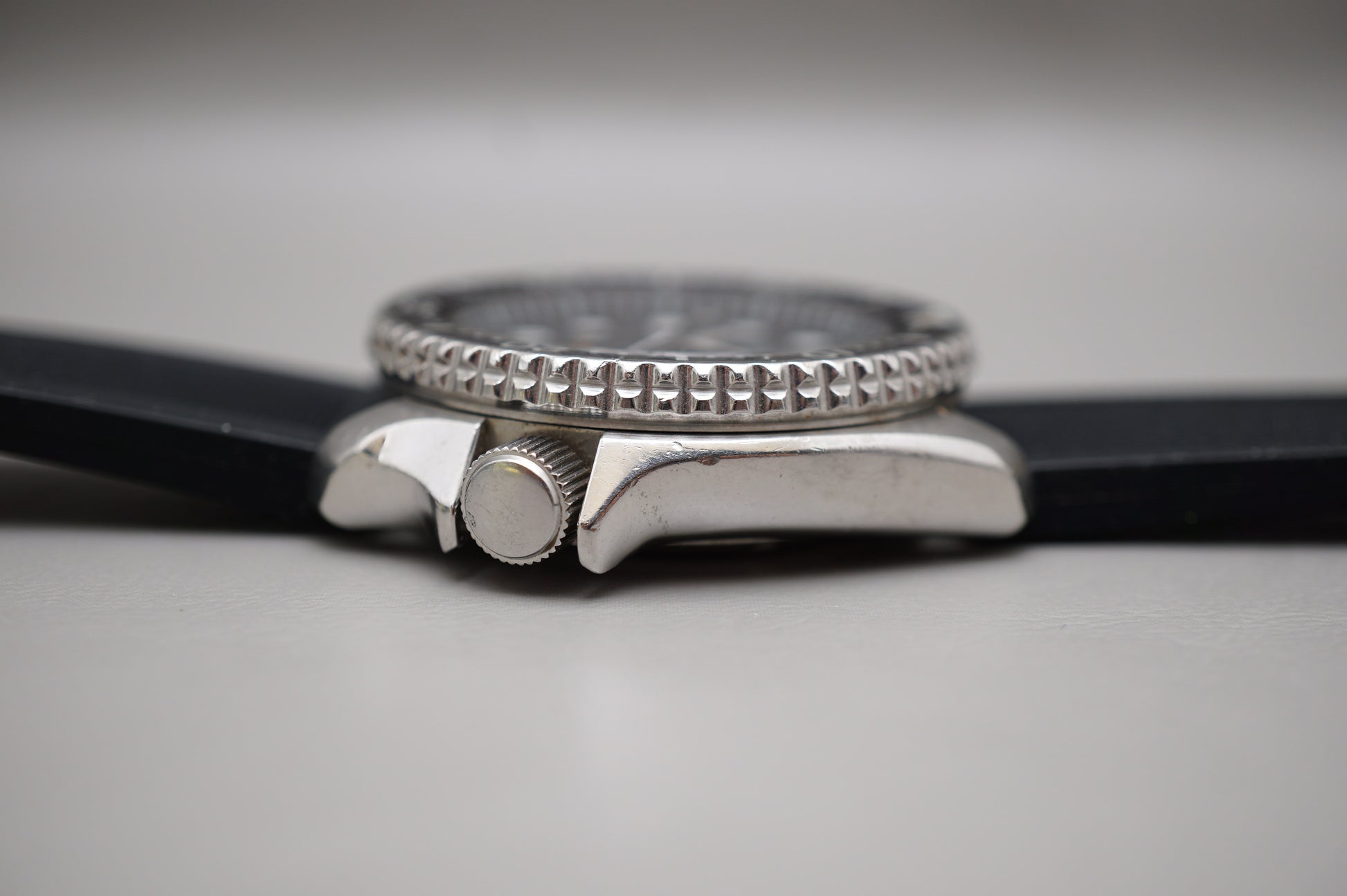 Bezel turns and clicks unidirectionally, crown has approximately one turn of thread remaining. Original condition, wear on crystal.