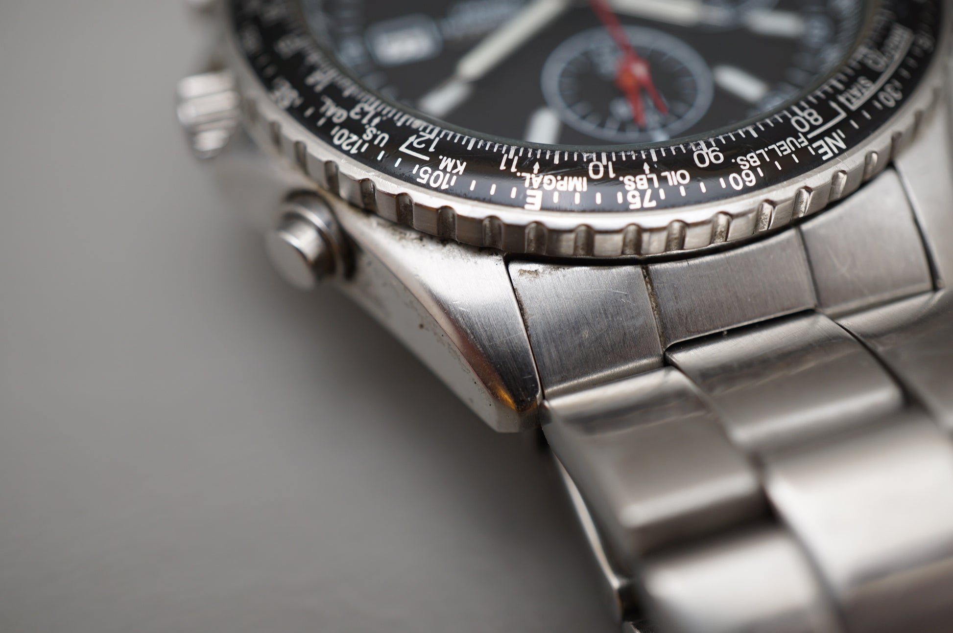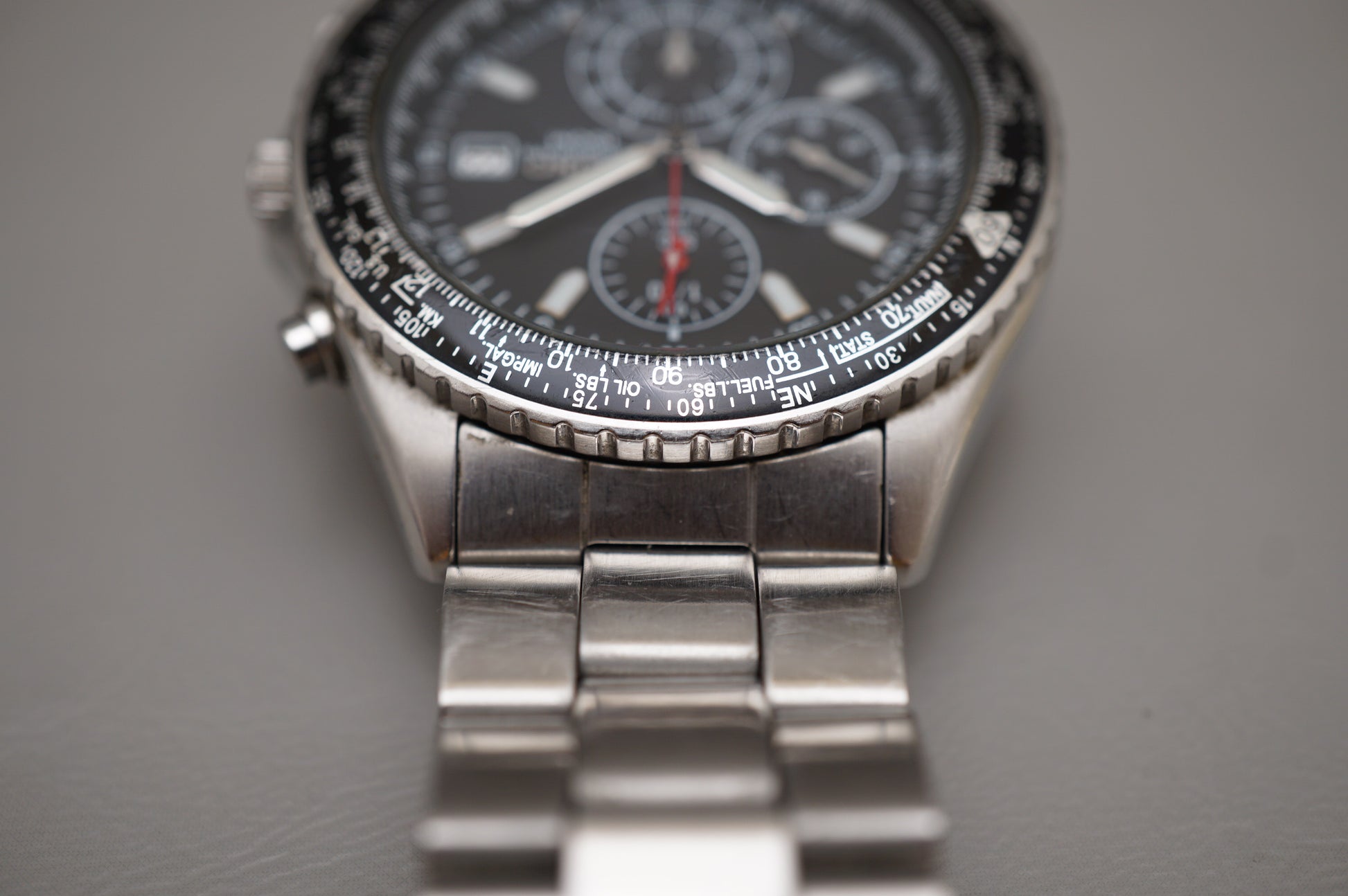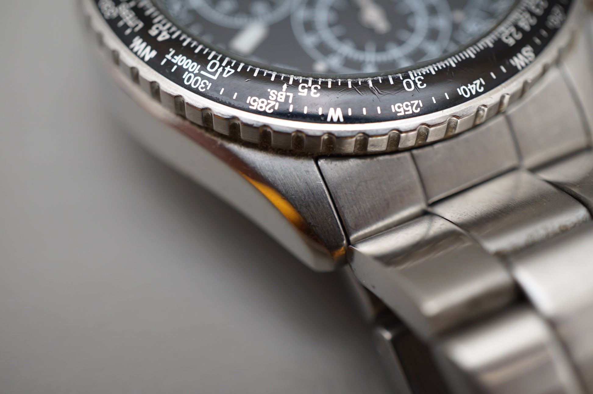 Chronograph functions correctly, bezel is stuck, wear on crystal.