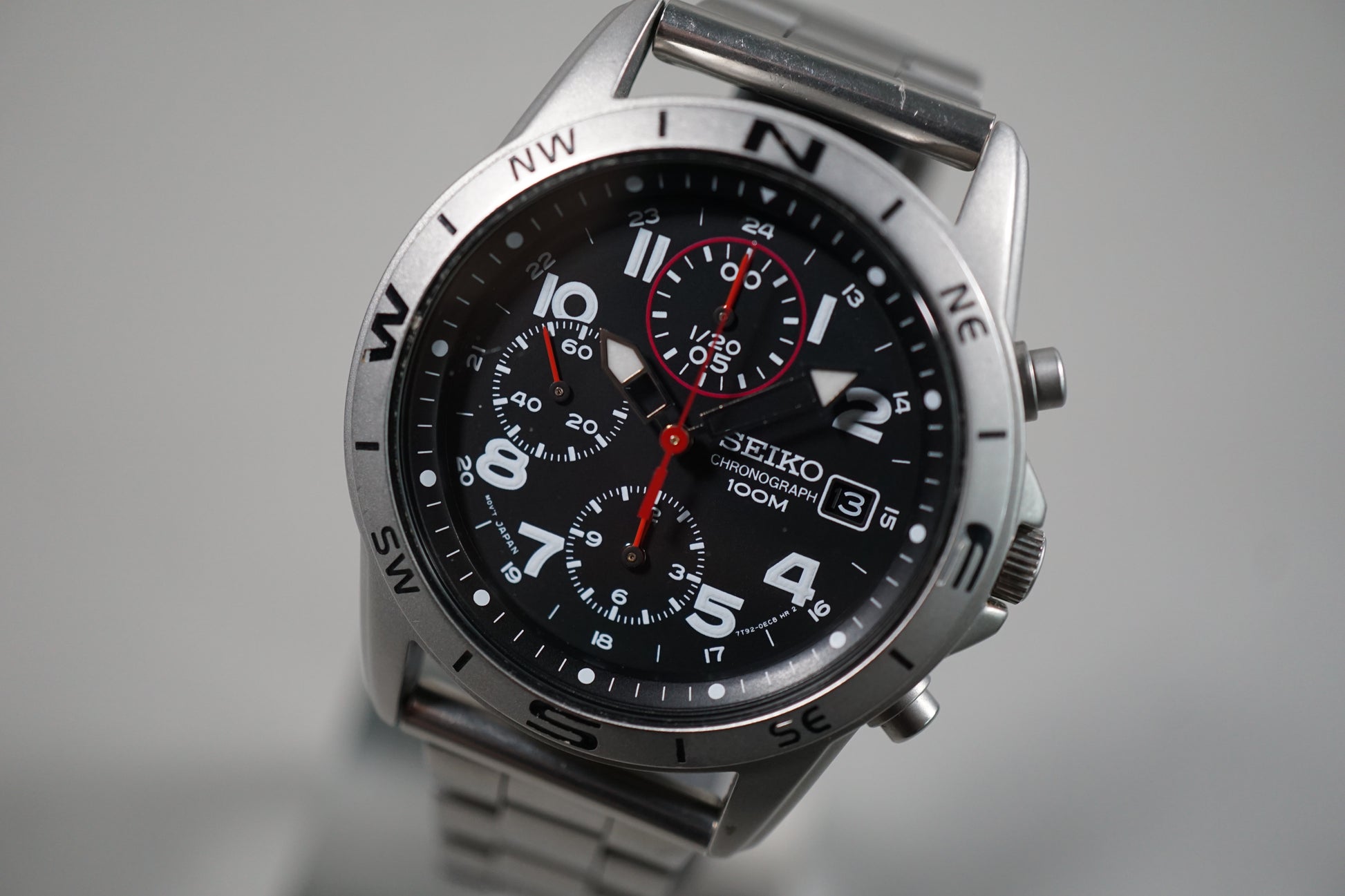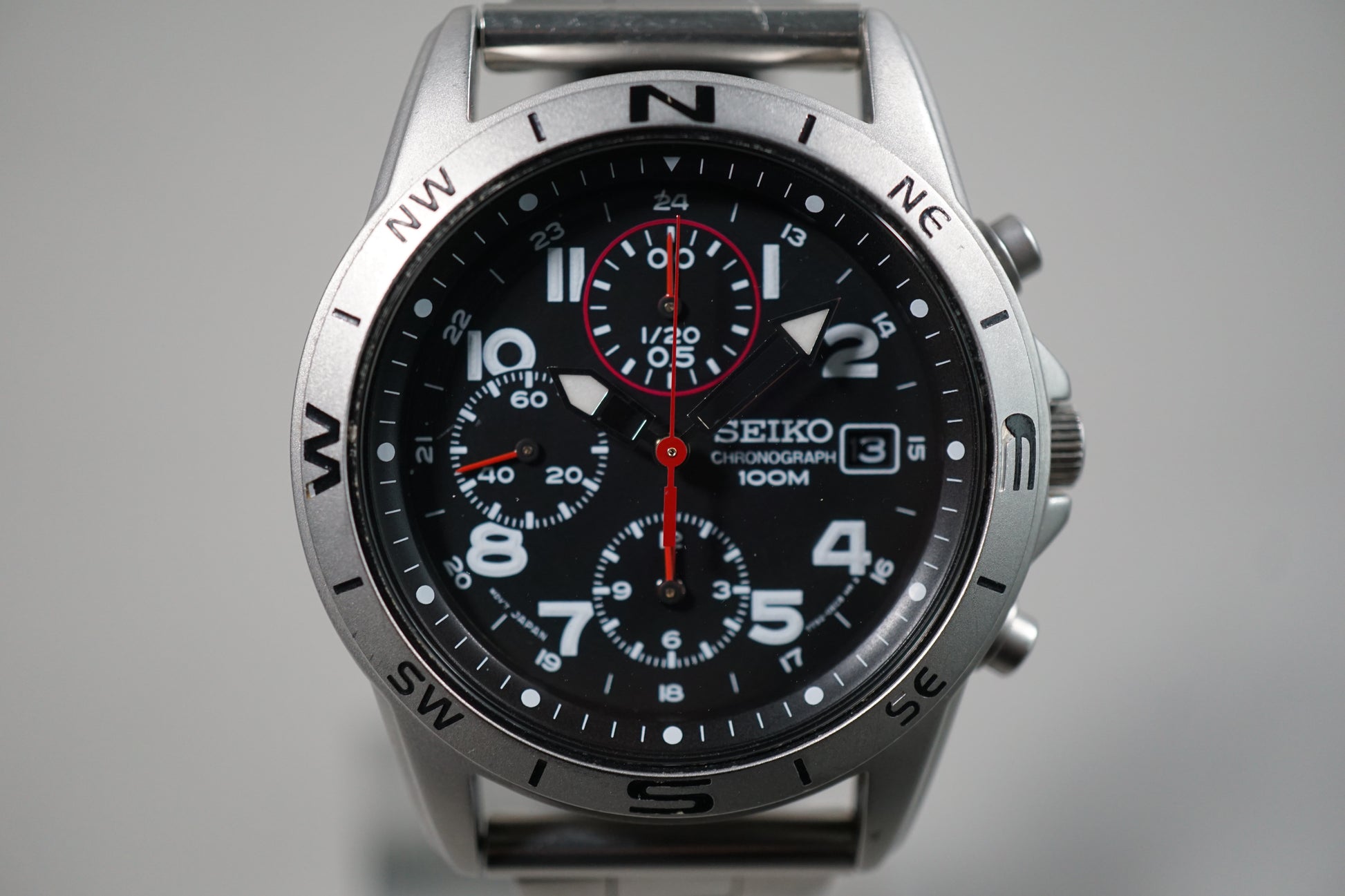 For sale is a Seiko SND375 Black Dial Field Style Chronograph Quartz Watch