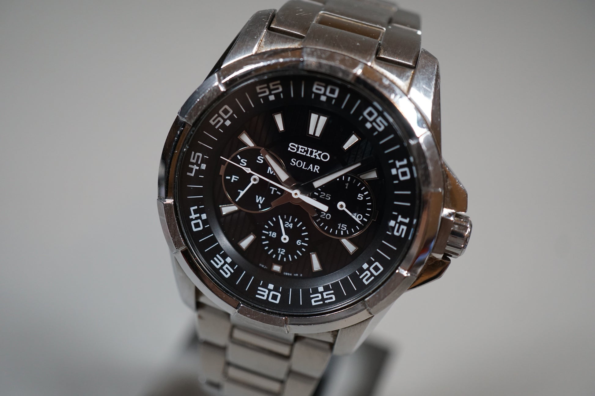 For sale is a Seiko SNE015P1 Day Date Black Dial Solar Quartz Watch
