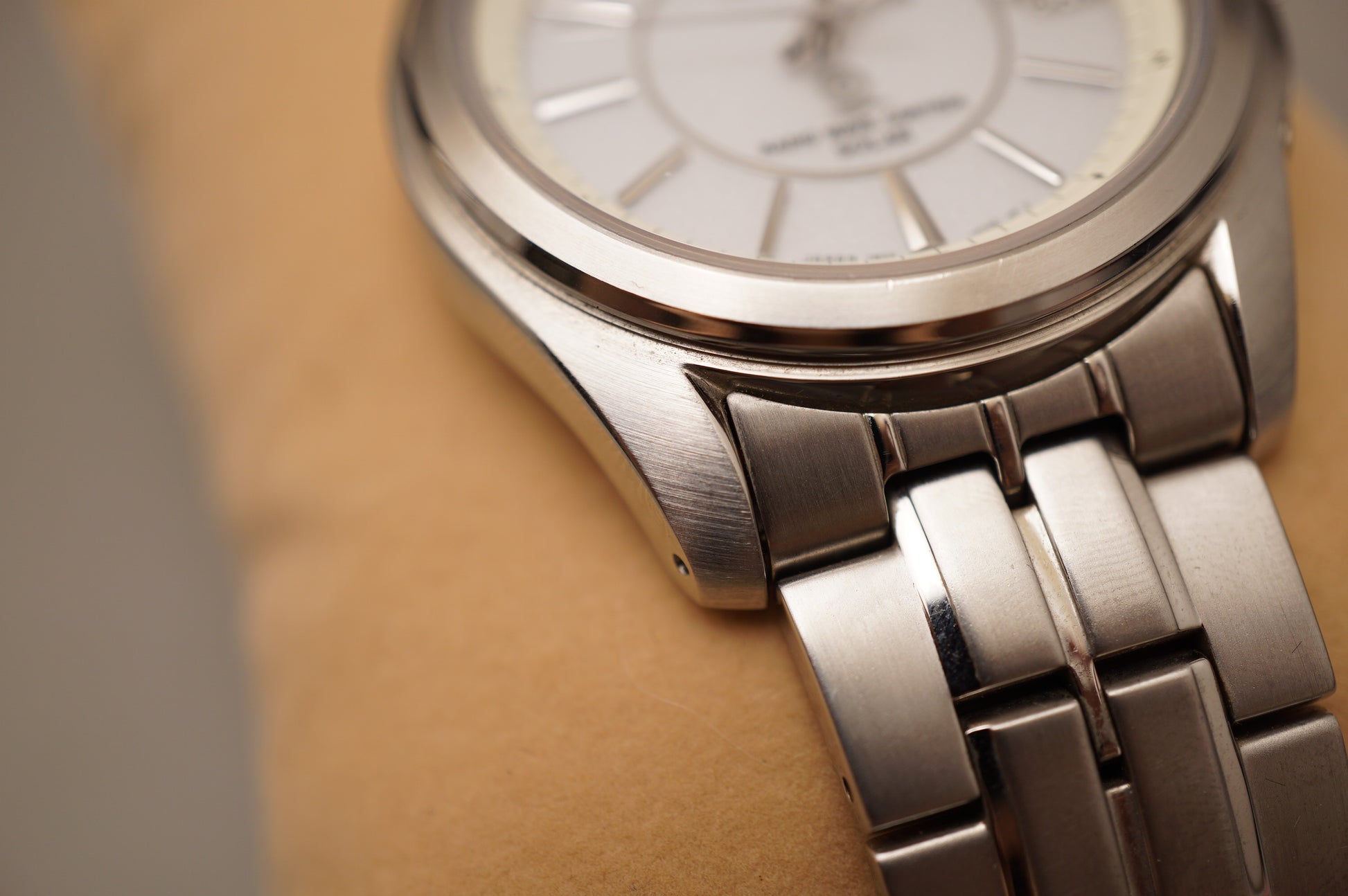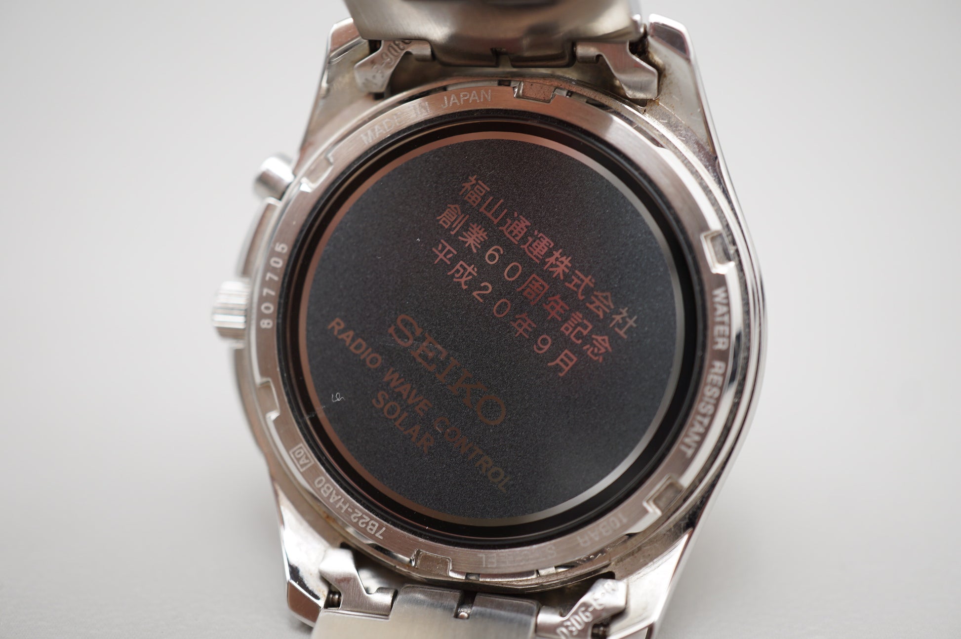 Commemorative watch, caseback is engraved and dial has Fukuyama Transporting logo. Radio wave time setting is a JDM feature but fan be emulated with phone apps.