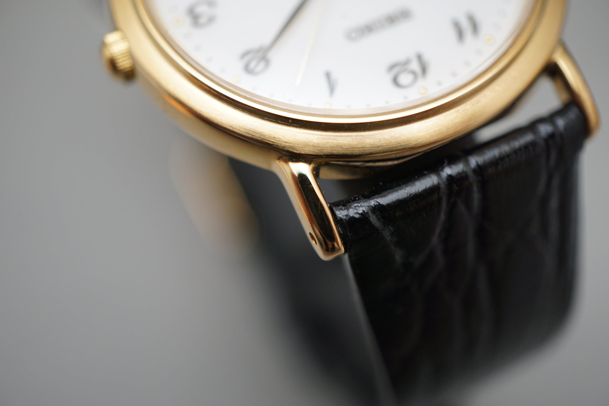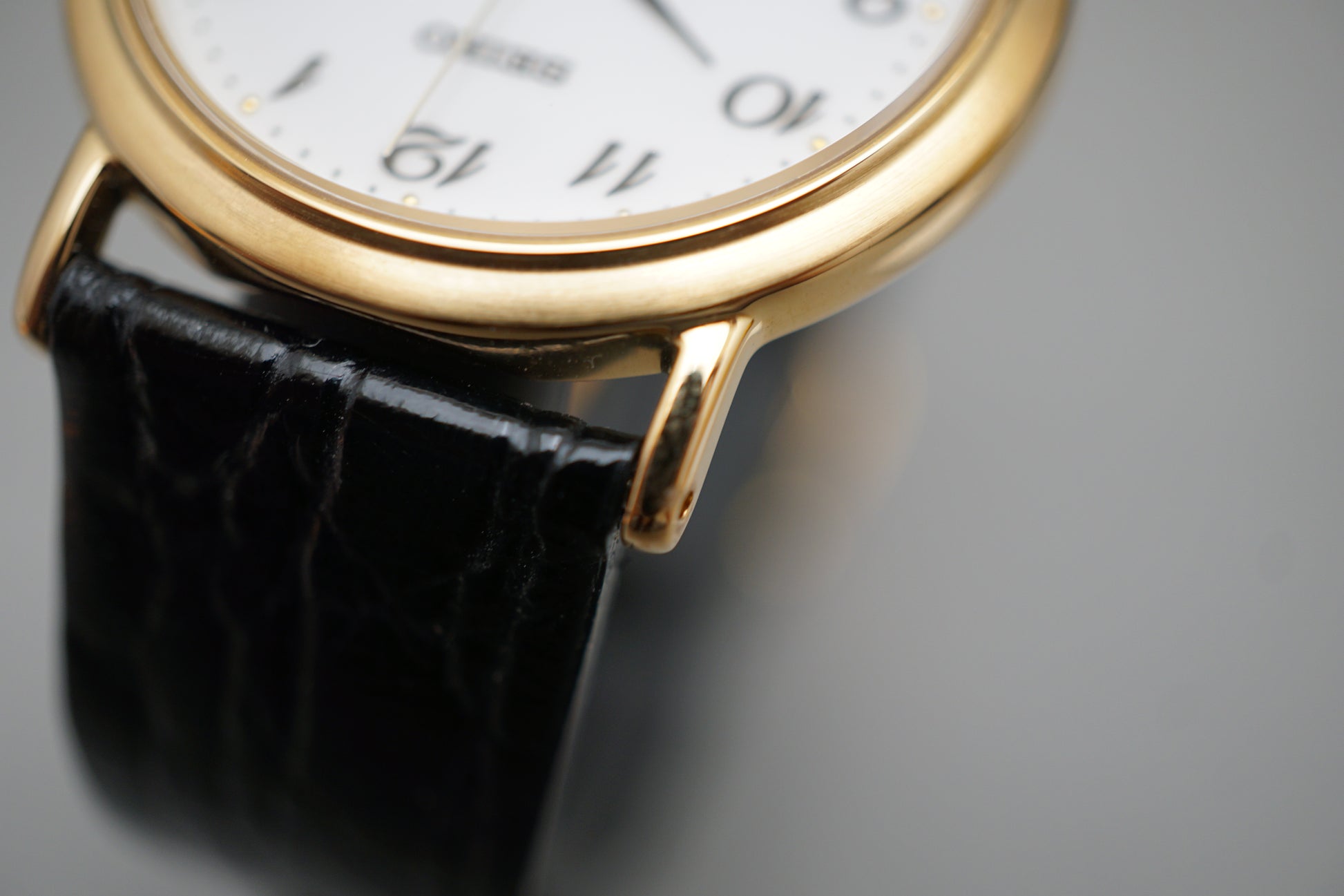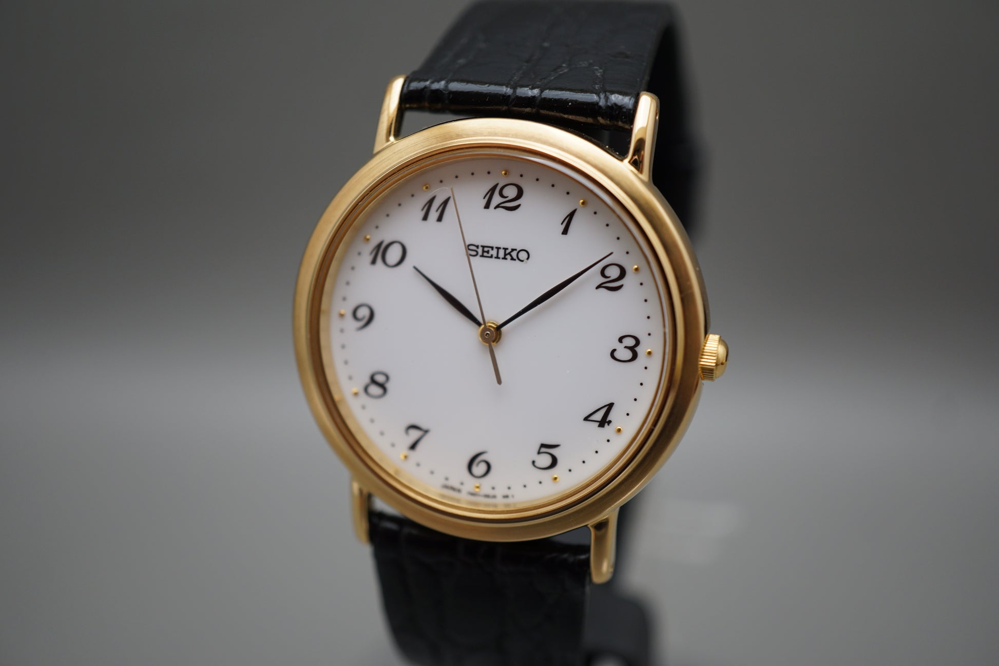 For sale is a Seiko Spirit SCDP030 Gold Tone White Numeral Dial Quartz Watch