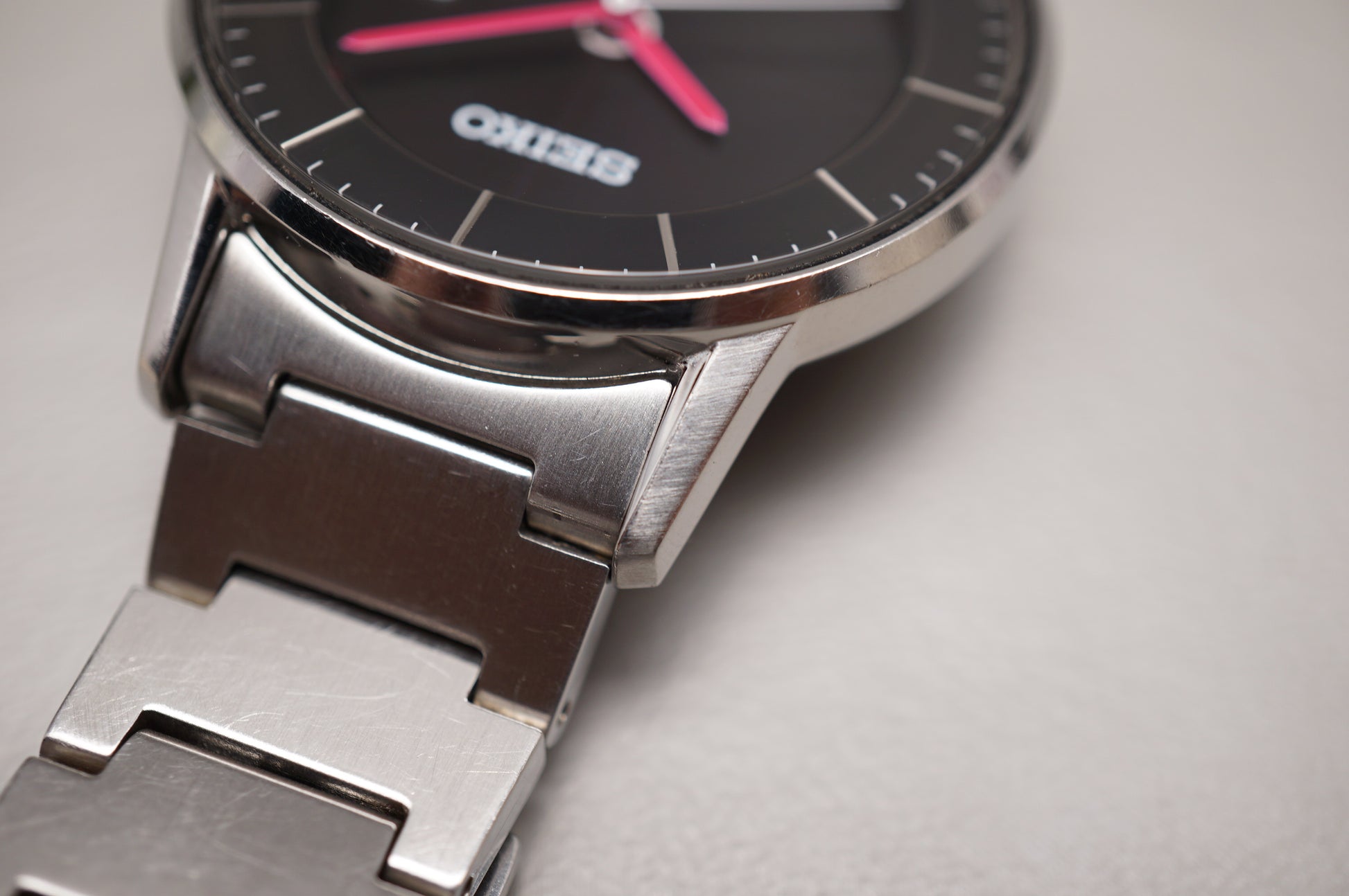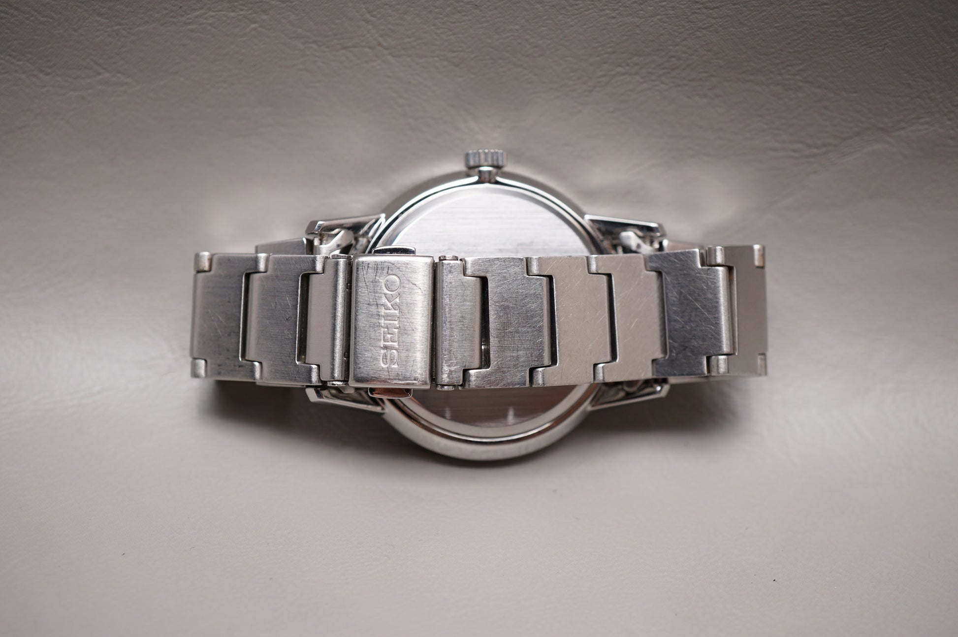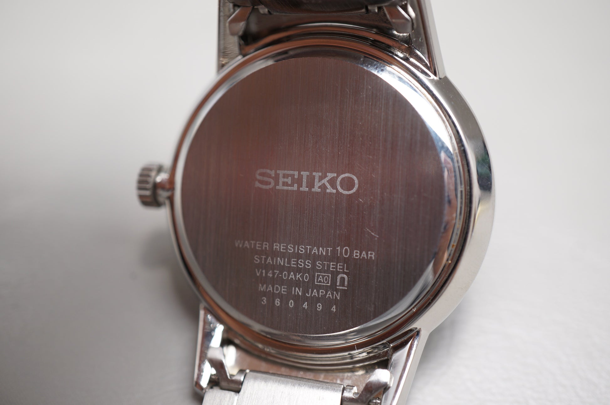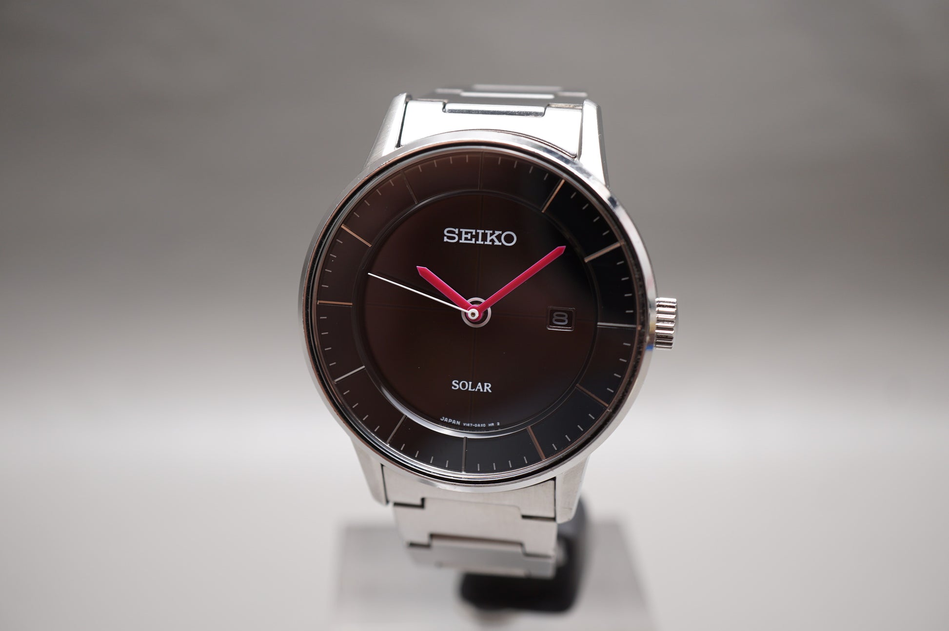 For sale is a Seiko Spirit V147-0AK0 Black Dial Pink Hands Sector Dial Solar Quartz Watch