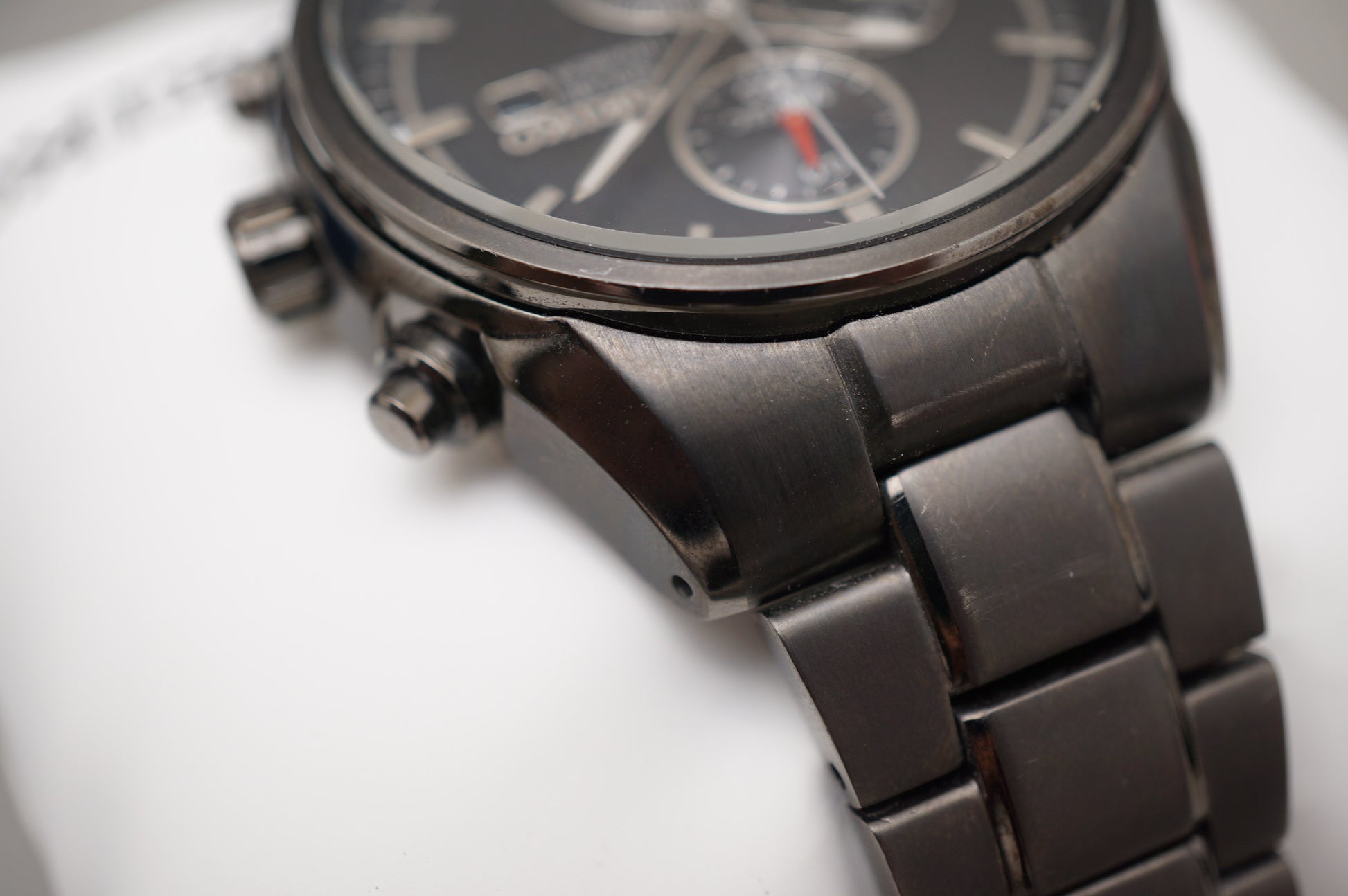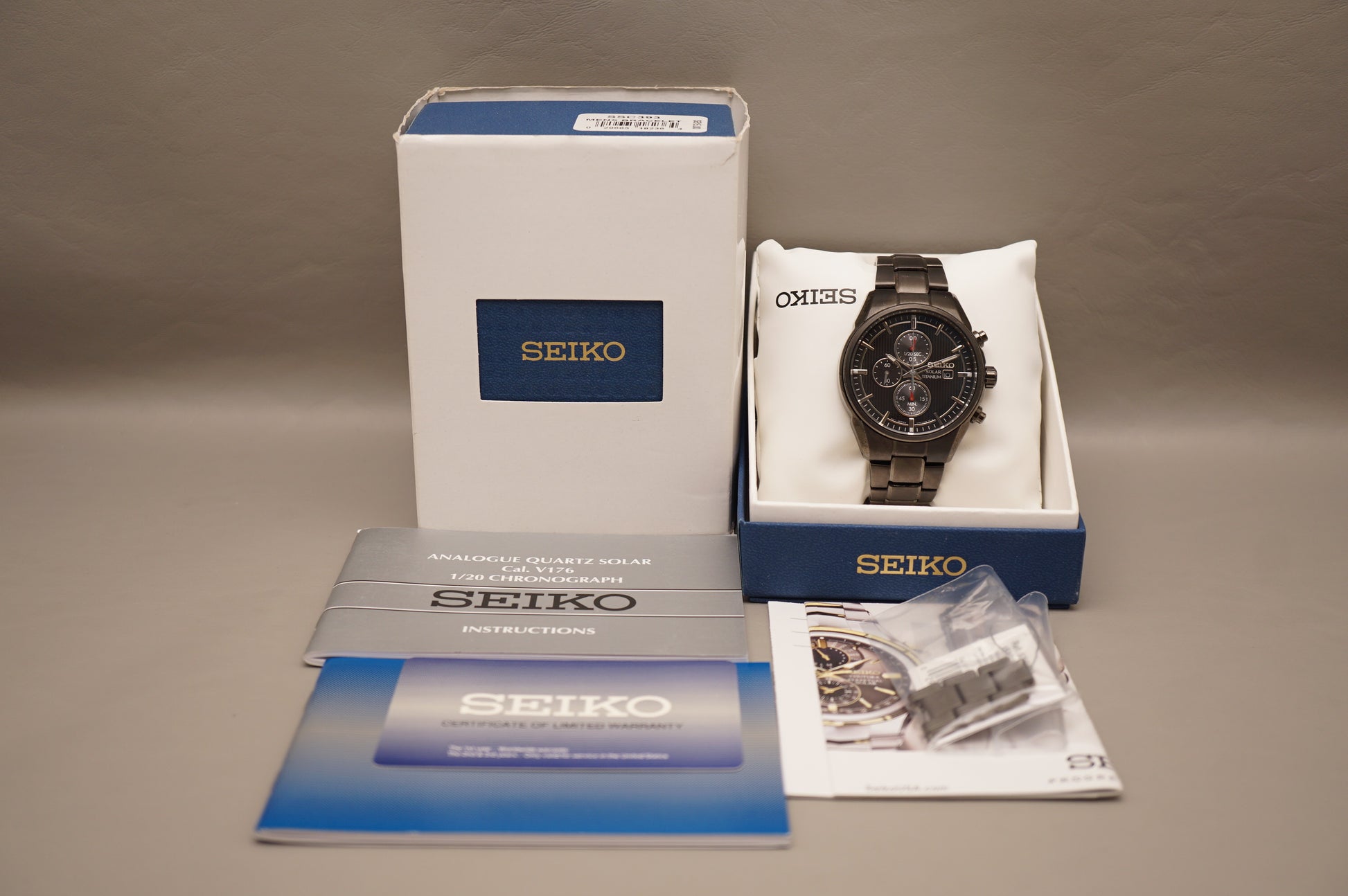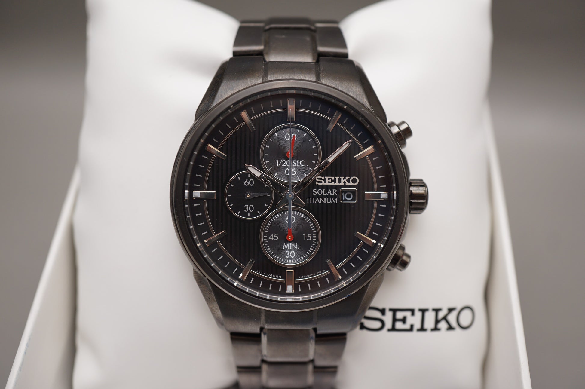For sale is a Seiko SSC393 Titanium Black 1/20Th Seconds Chronograph Solar Quartz Watch