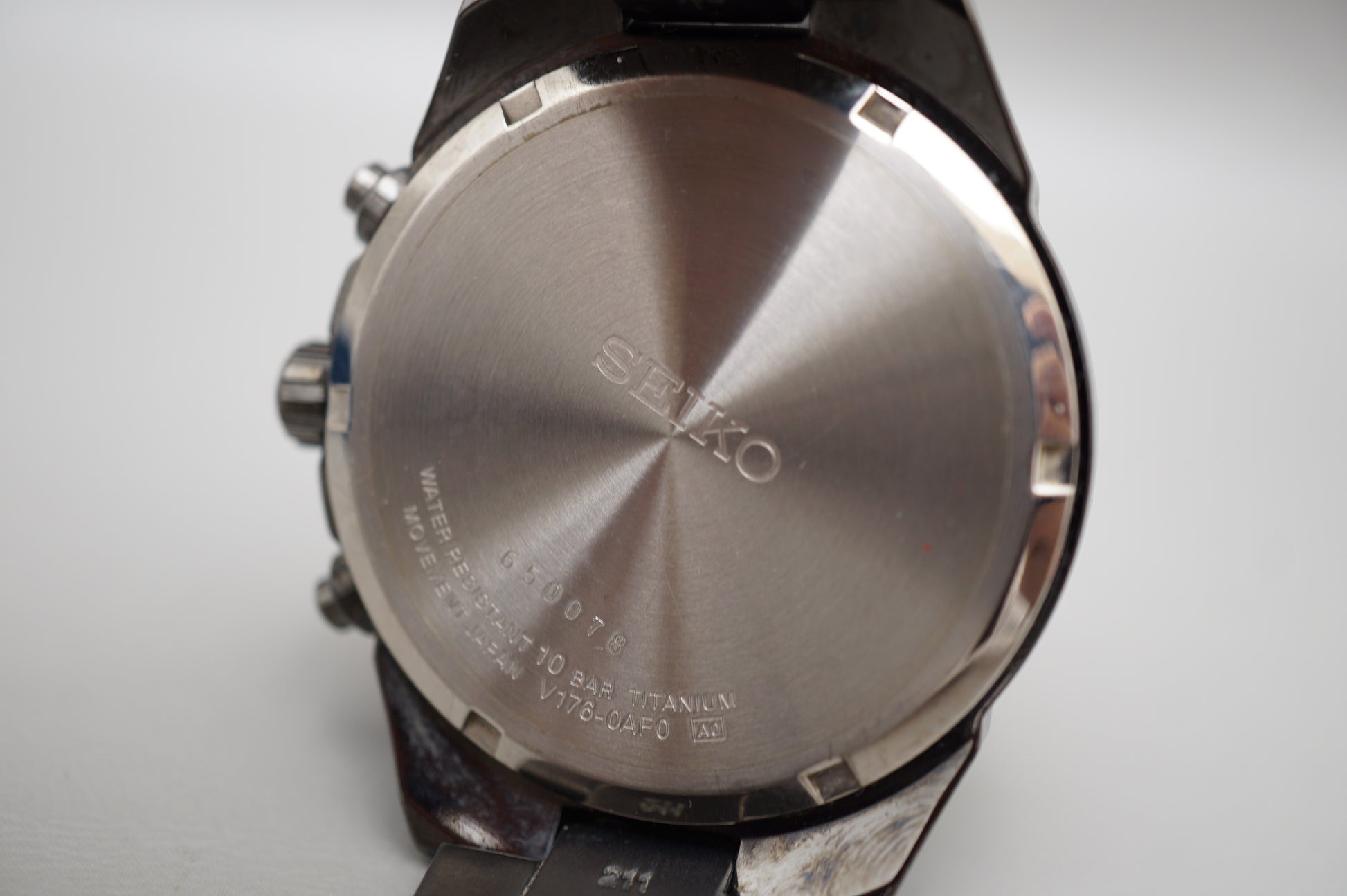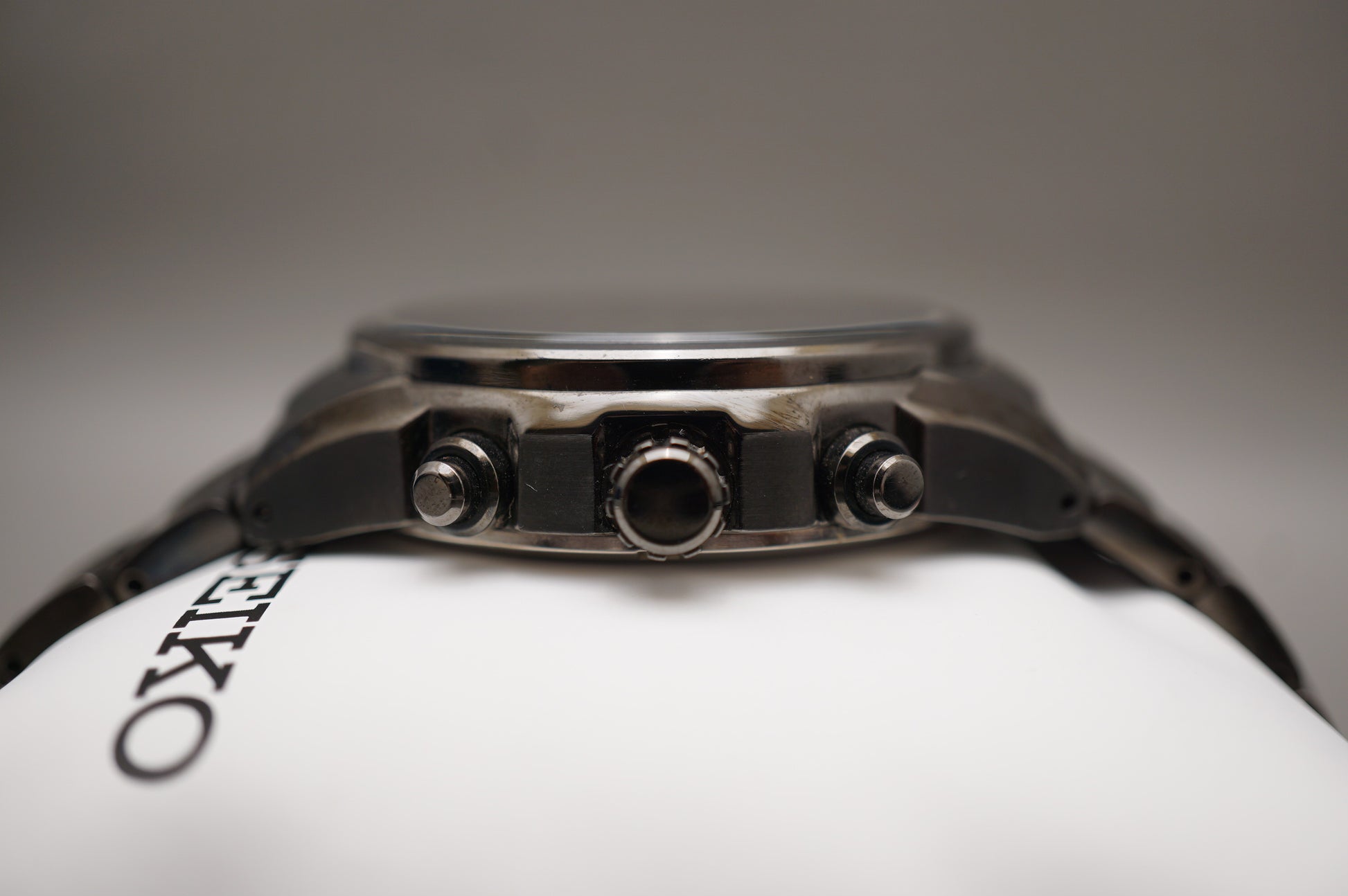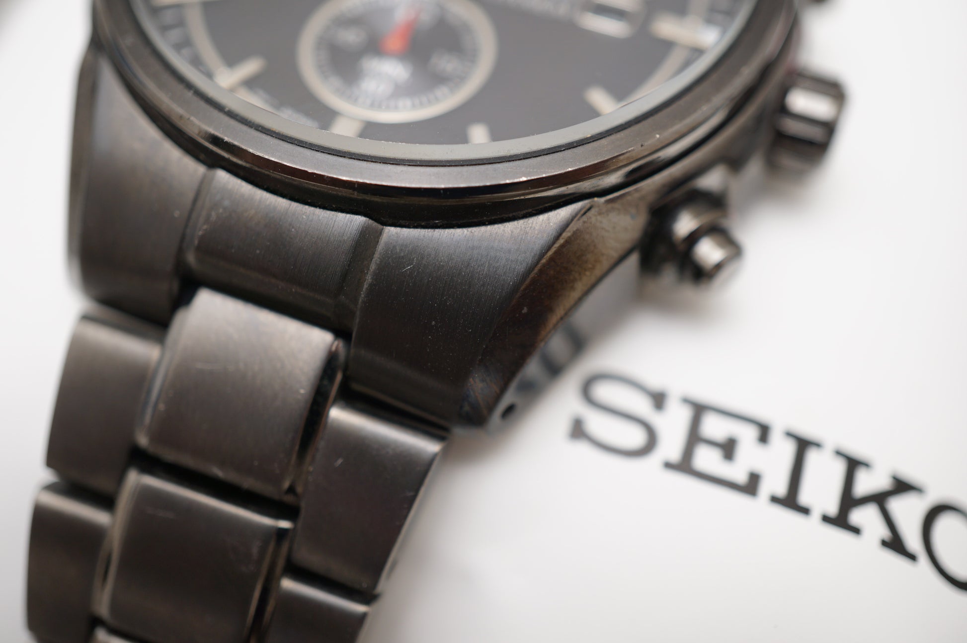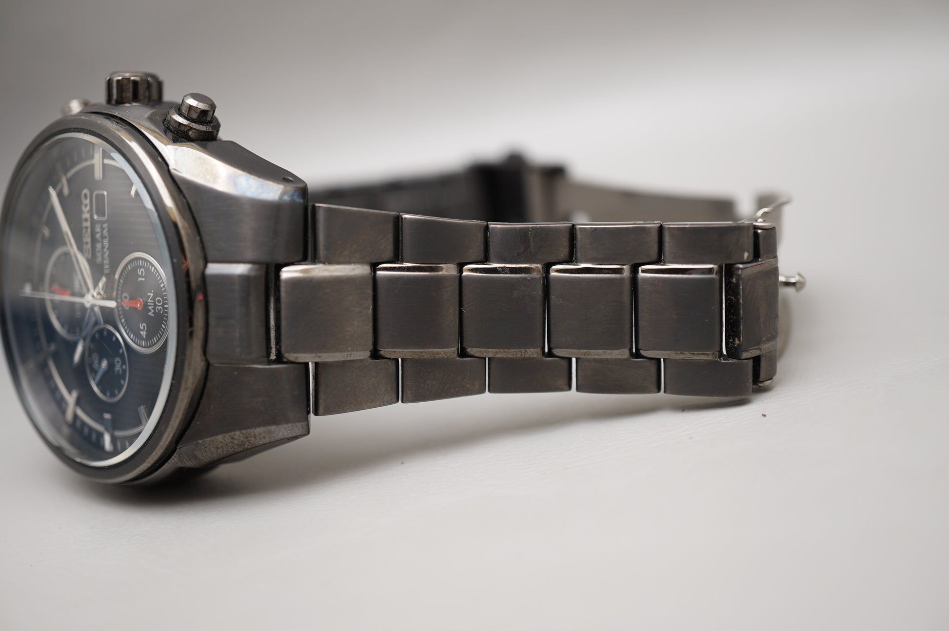 For sale is a Seiko SSC393 Titanium Black 1/20Th Seconds Chronograph Solar Quartz Watch