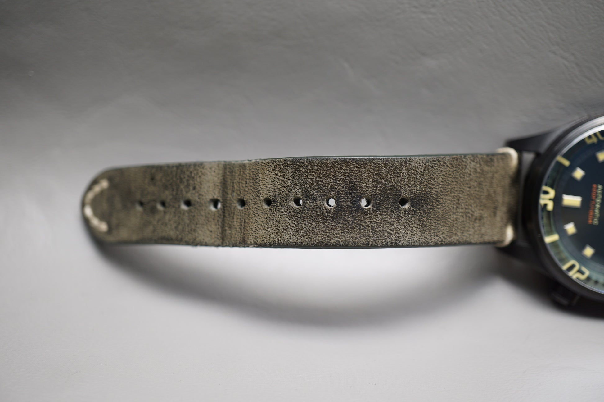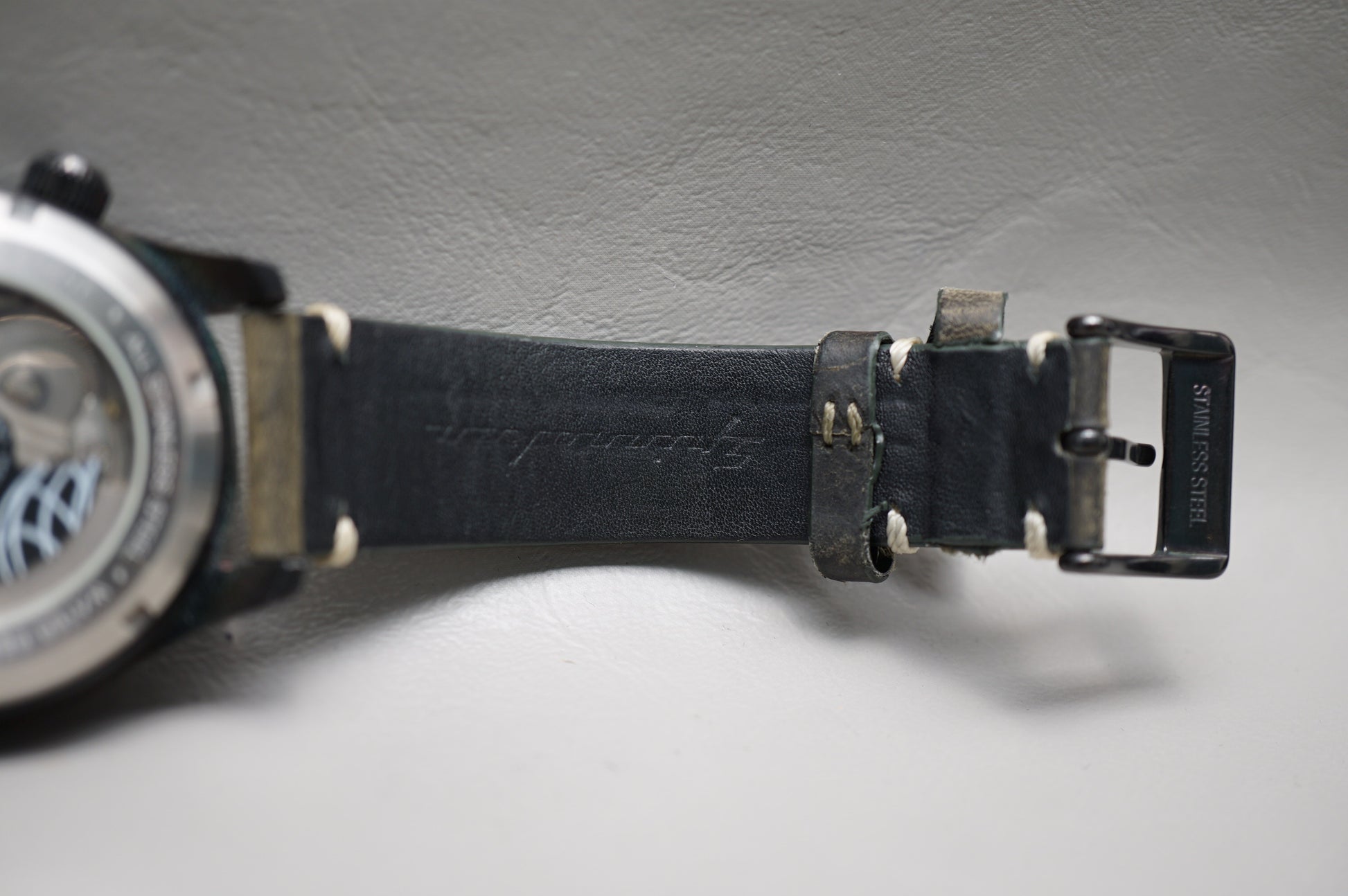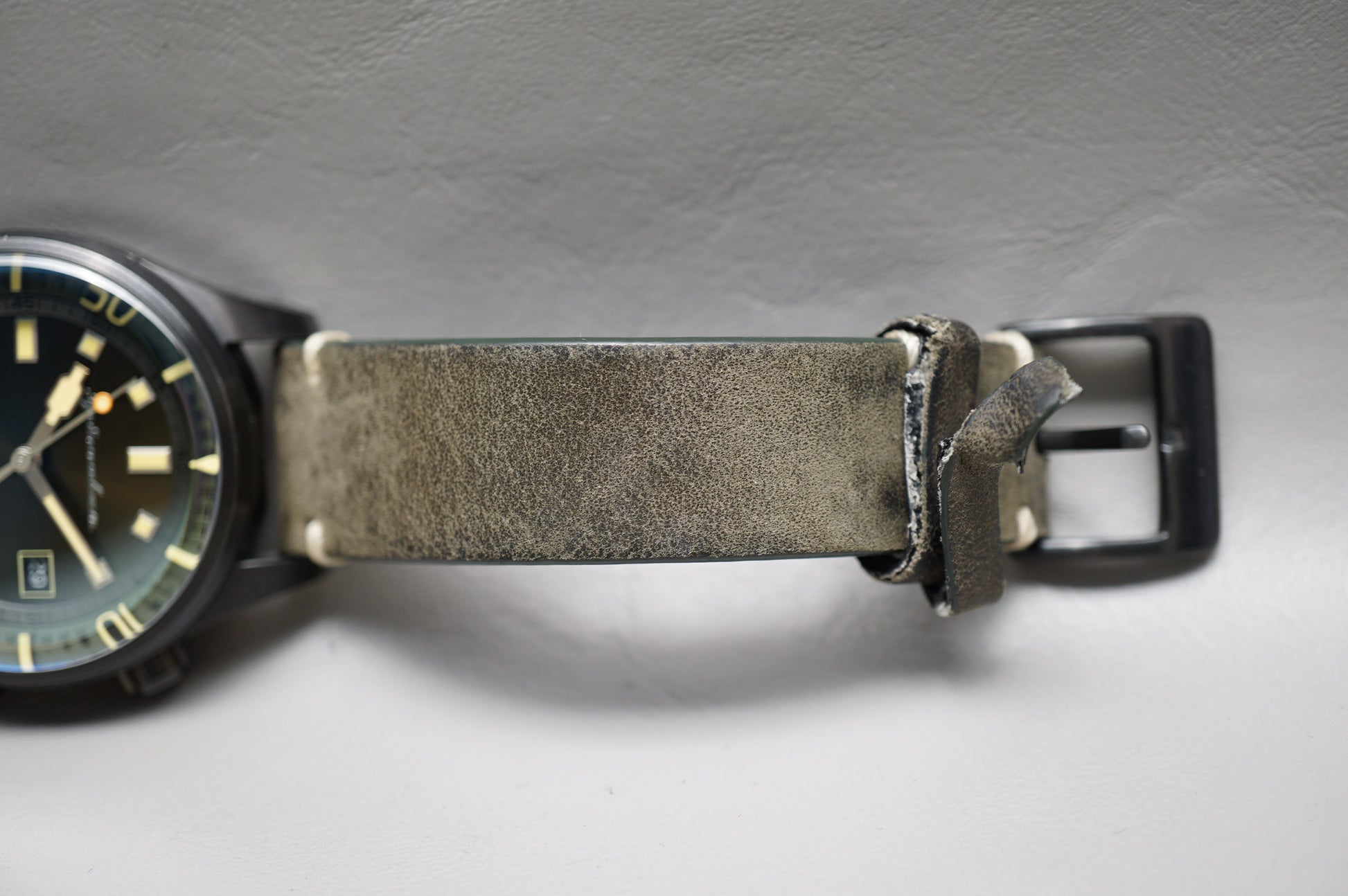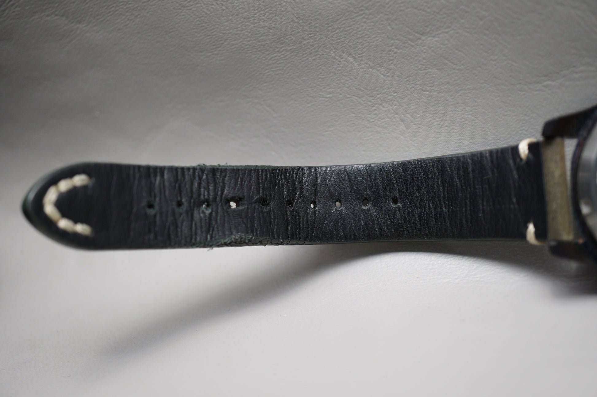 Strap: Original leather, cracking from wear. Broken and deteriorating strap loops.