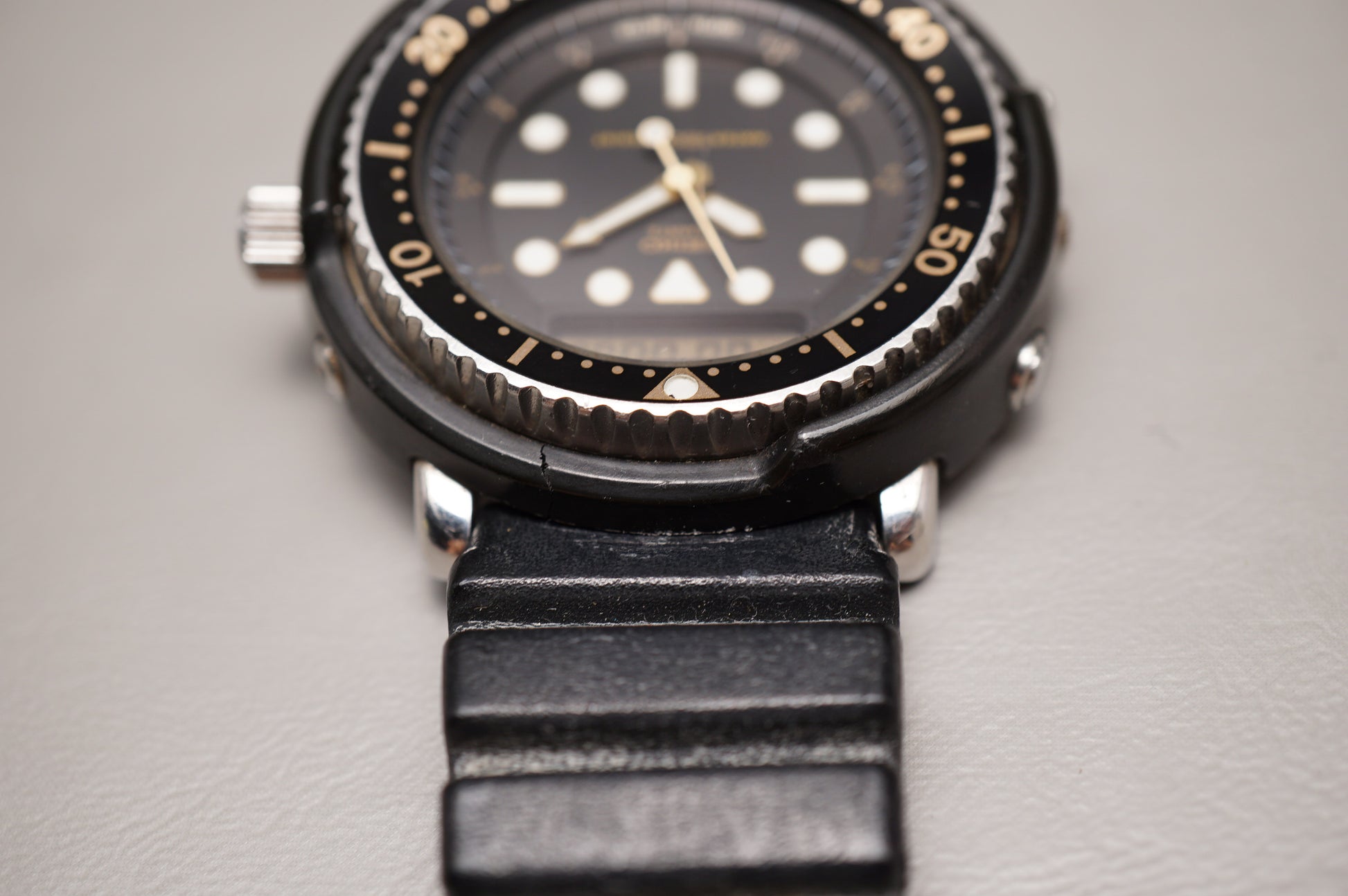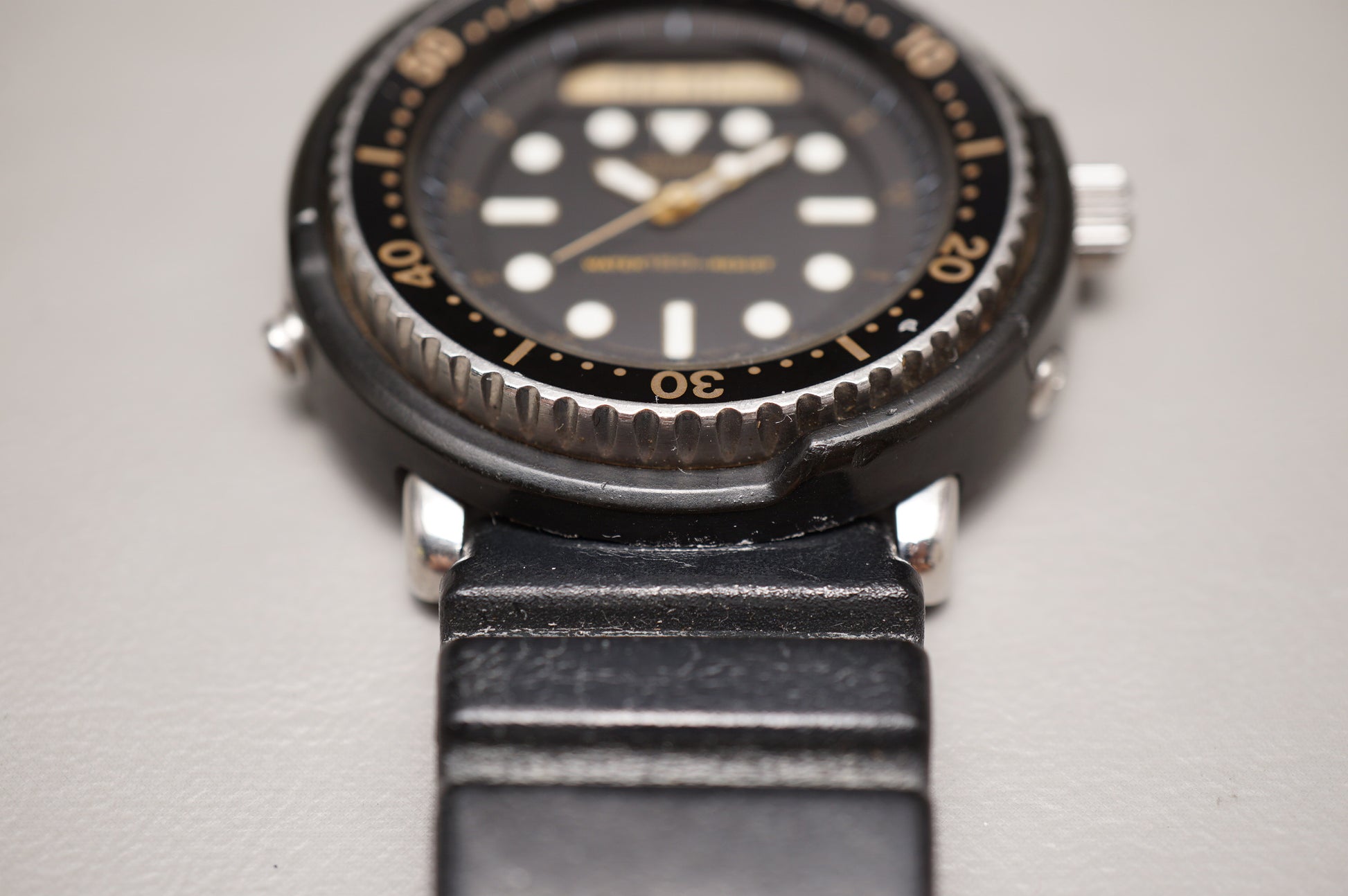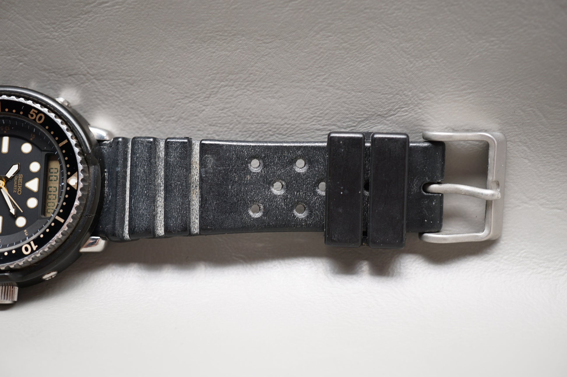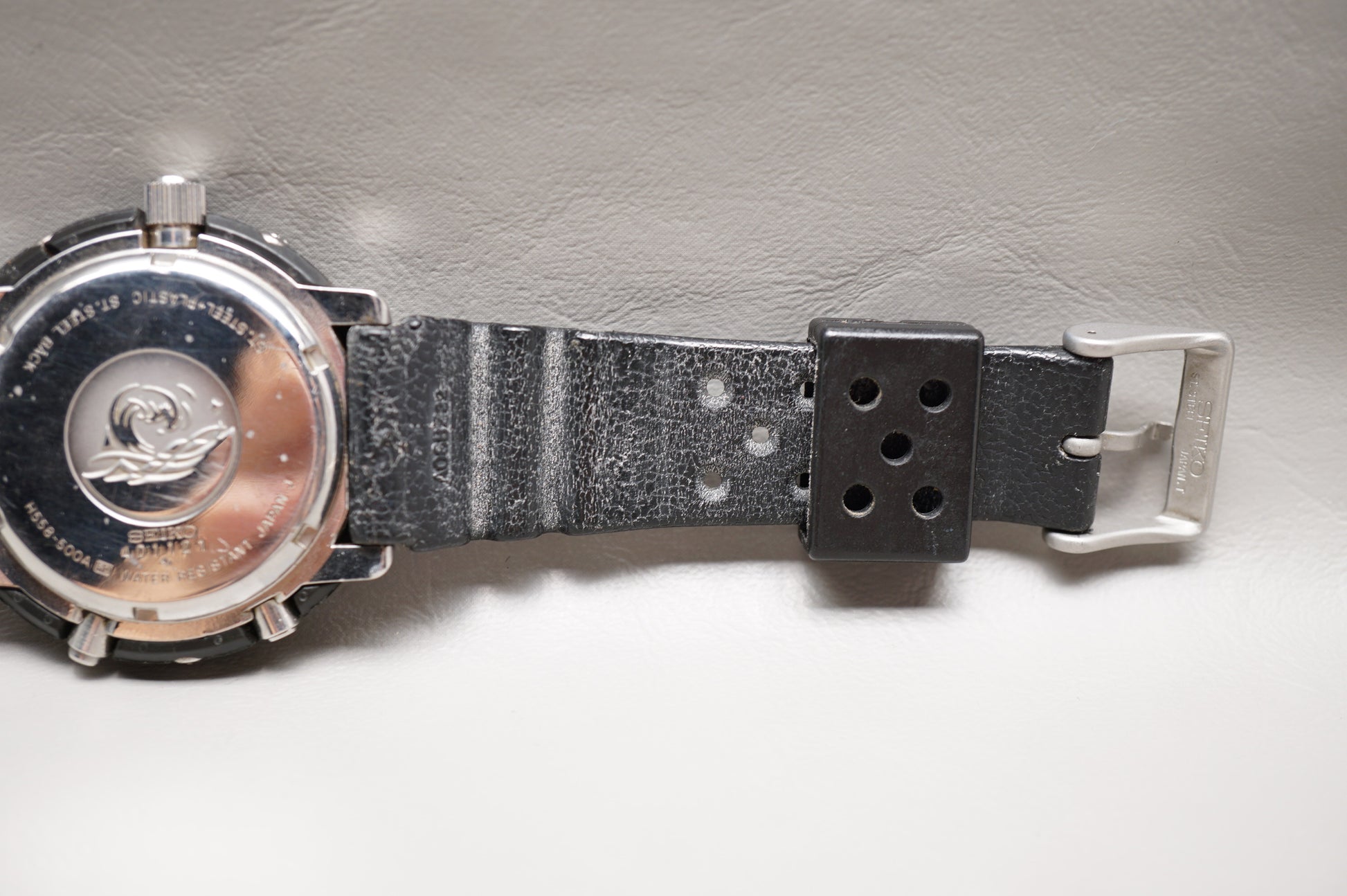 Strap: Vintage Seiko rubber, deterioration from age, should be replaced before wearing.