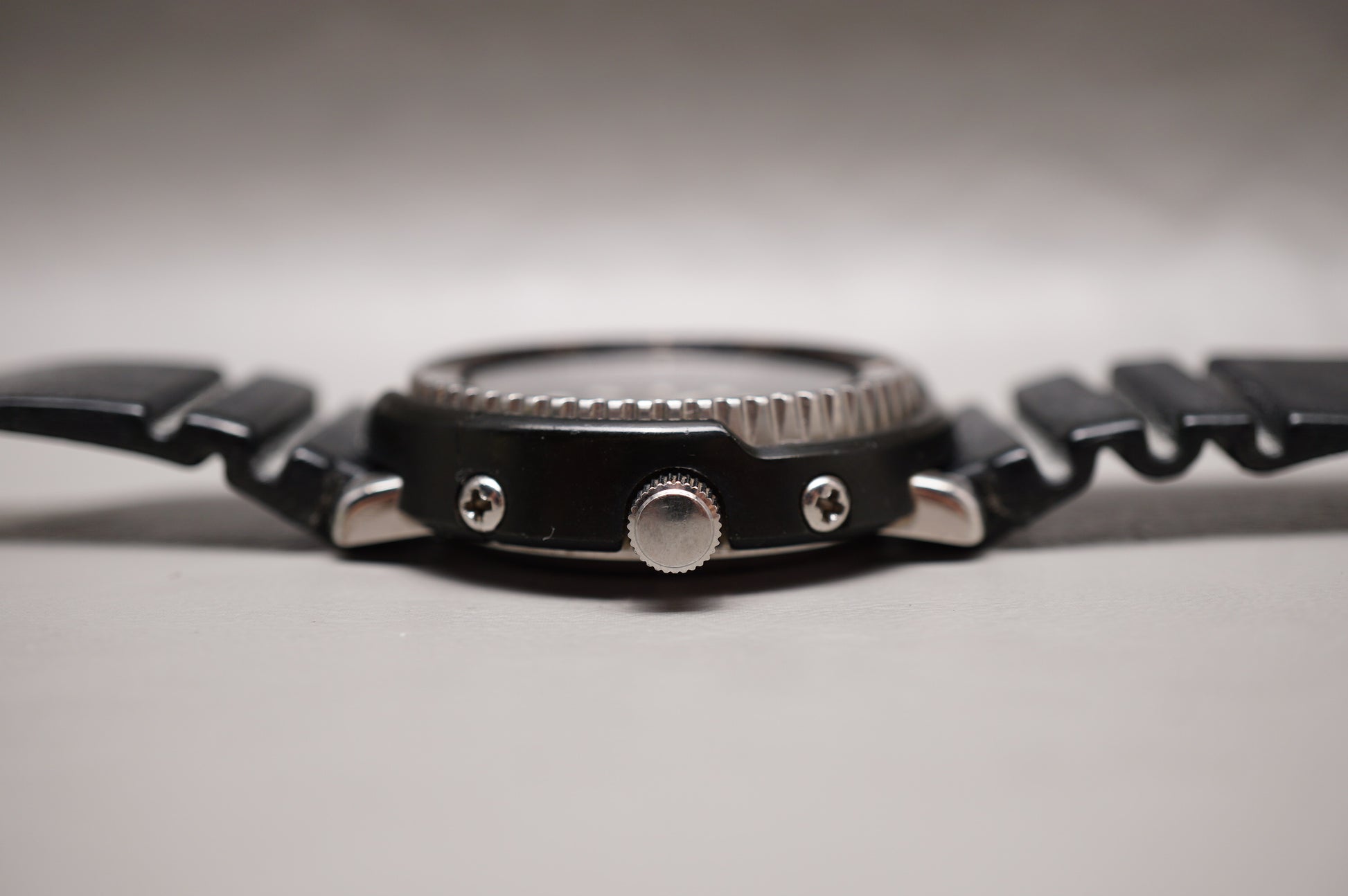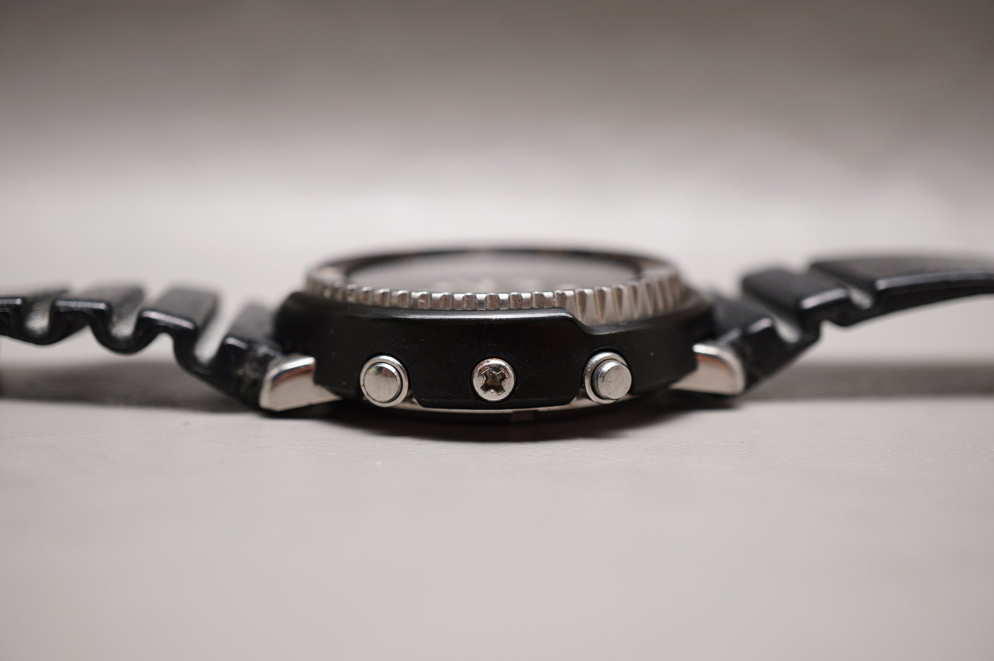 Serial dates production to December 1994. Rare 'Golden Arnie' with the gold tone indices on bezel and markers. Cracking on plastic shroud, crown screws down correctly, bezel turns and clicks bidirectionally. Pushers, digital display light, and alarm working correctly.