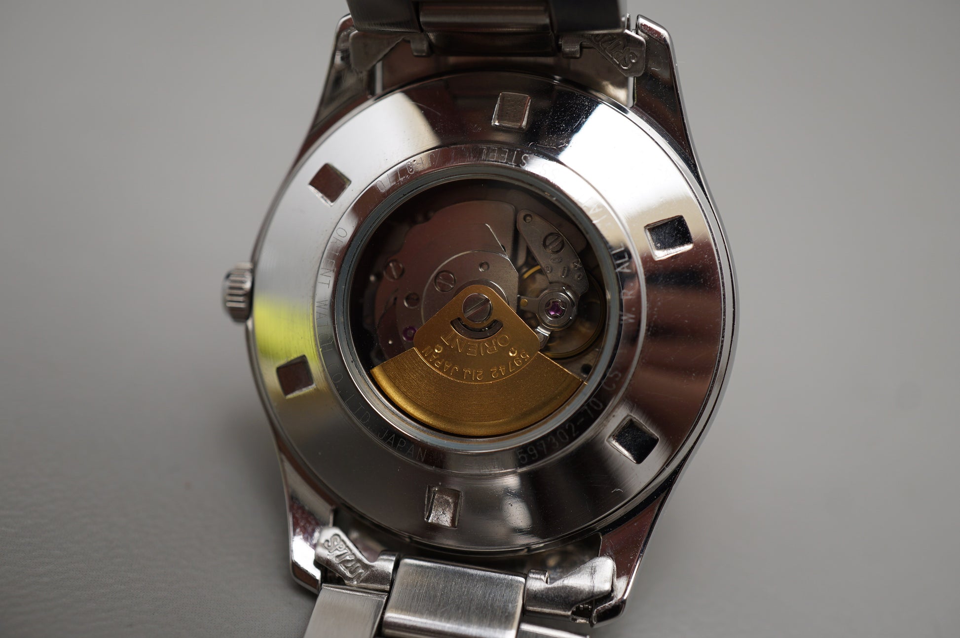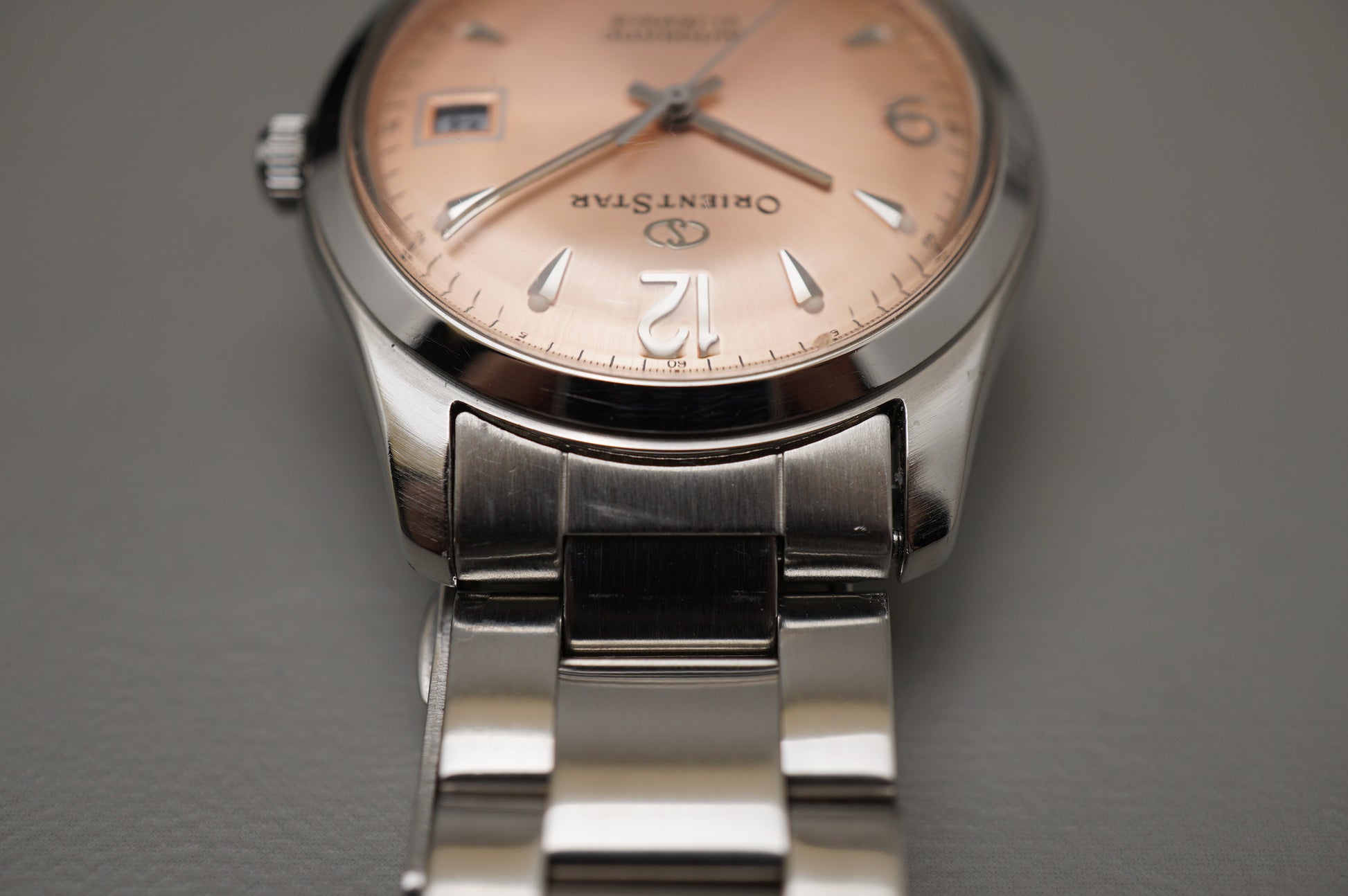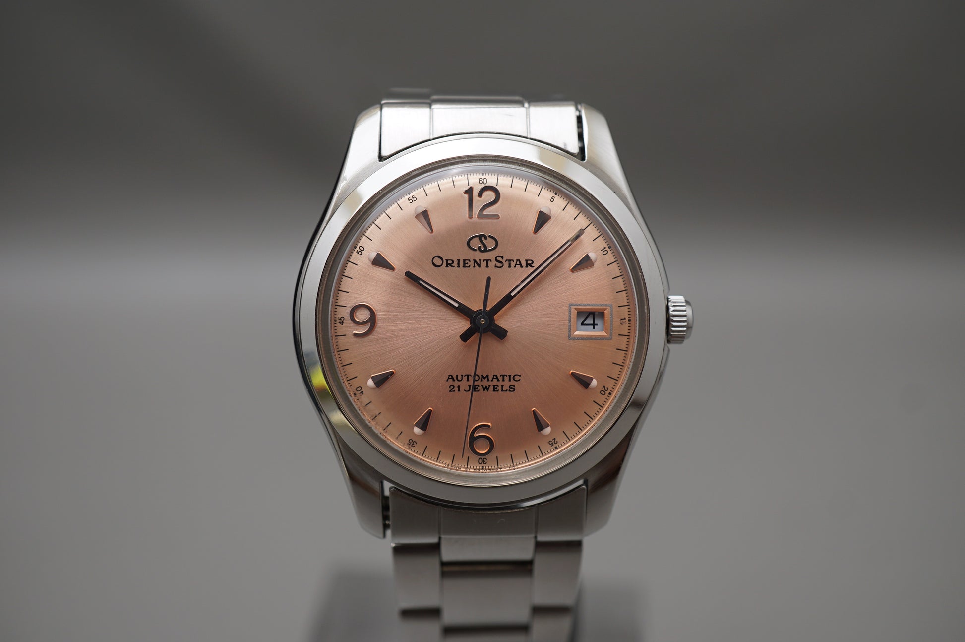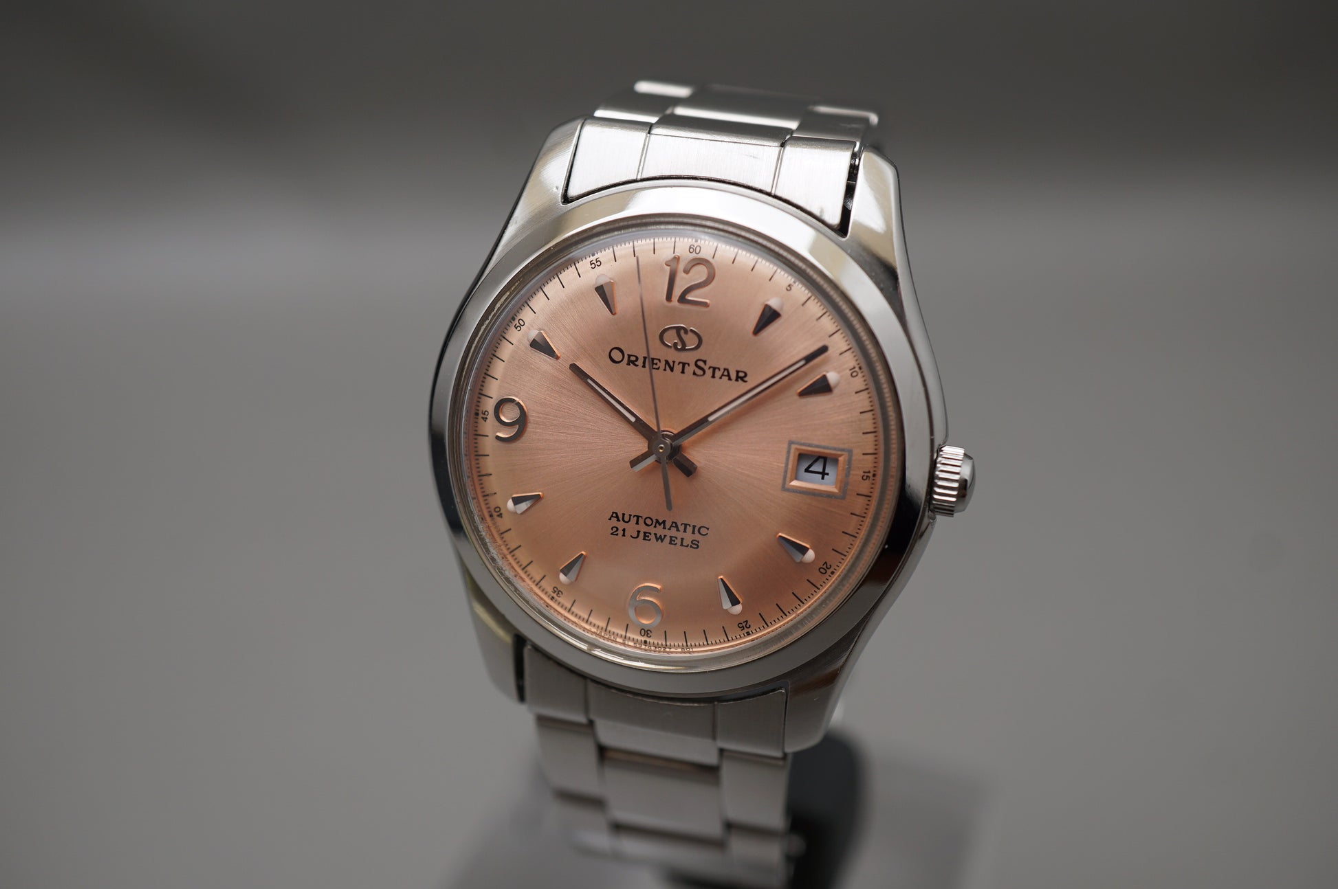 For sale is a Orient Star 597302-70 Salmon Explorer Style Dial Automatic Watch